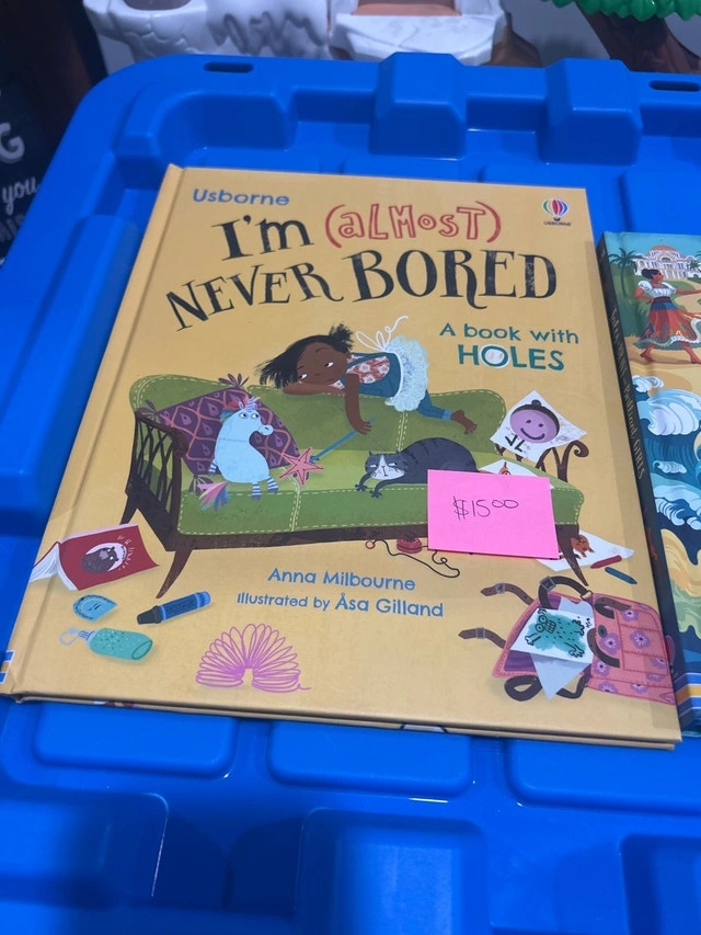 * **I'm (almost) Never Bored: A Book with Holes** - A fun book with holes to peek through and explore, sparking creativity and imagination. In good condition.