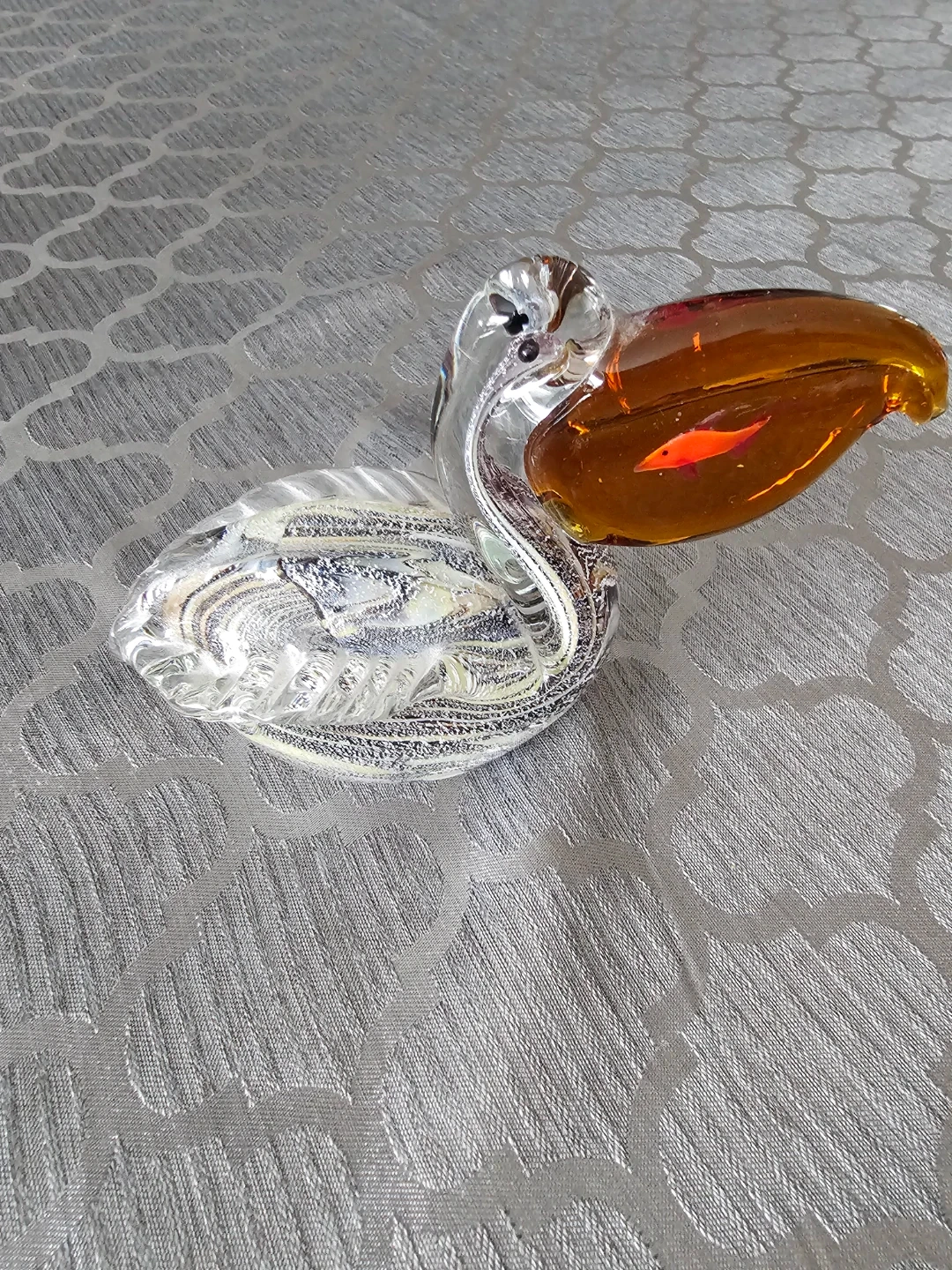 Decorative glass figurine of a pelican. It has a clear body with swirled detailing and an amber beak. This piece adds a touch of charm to any space.🧡