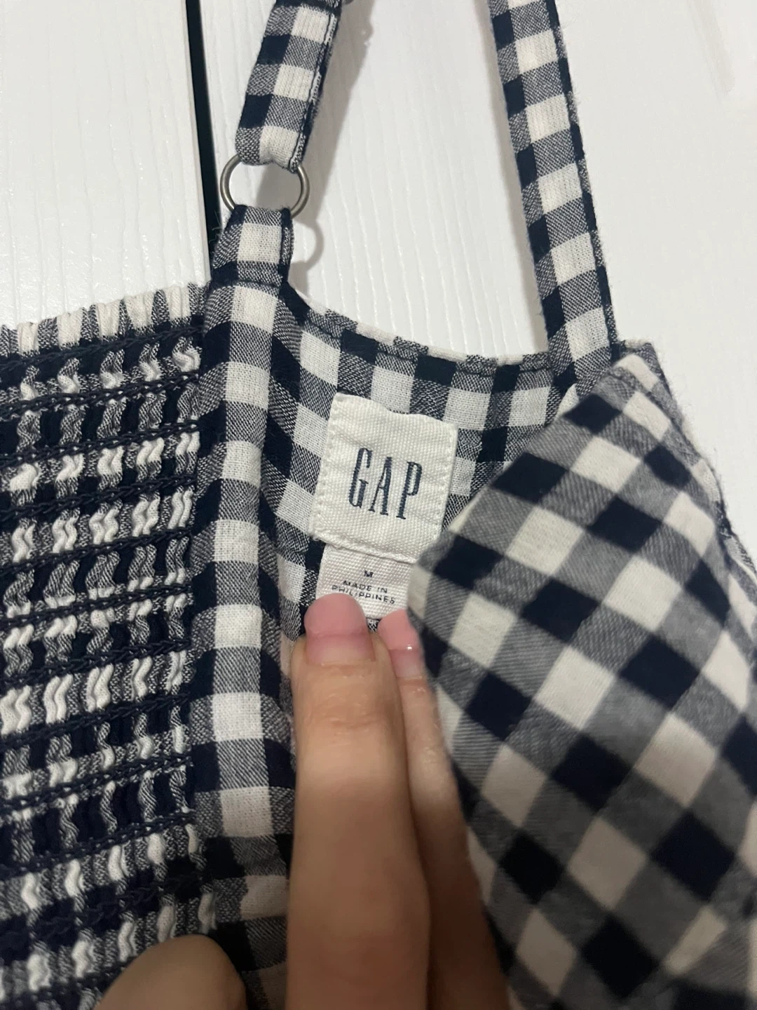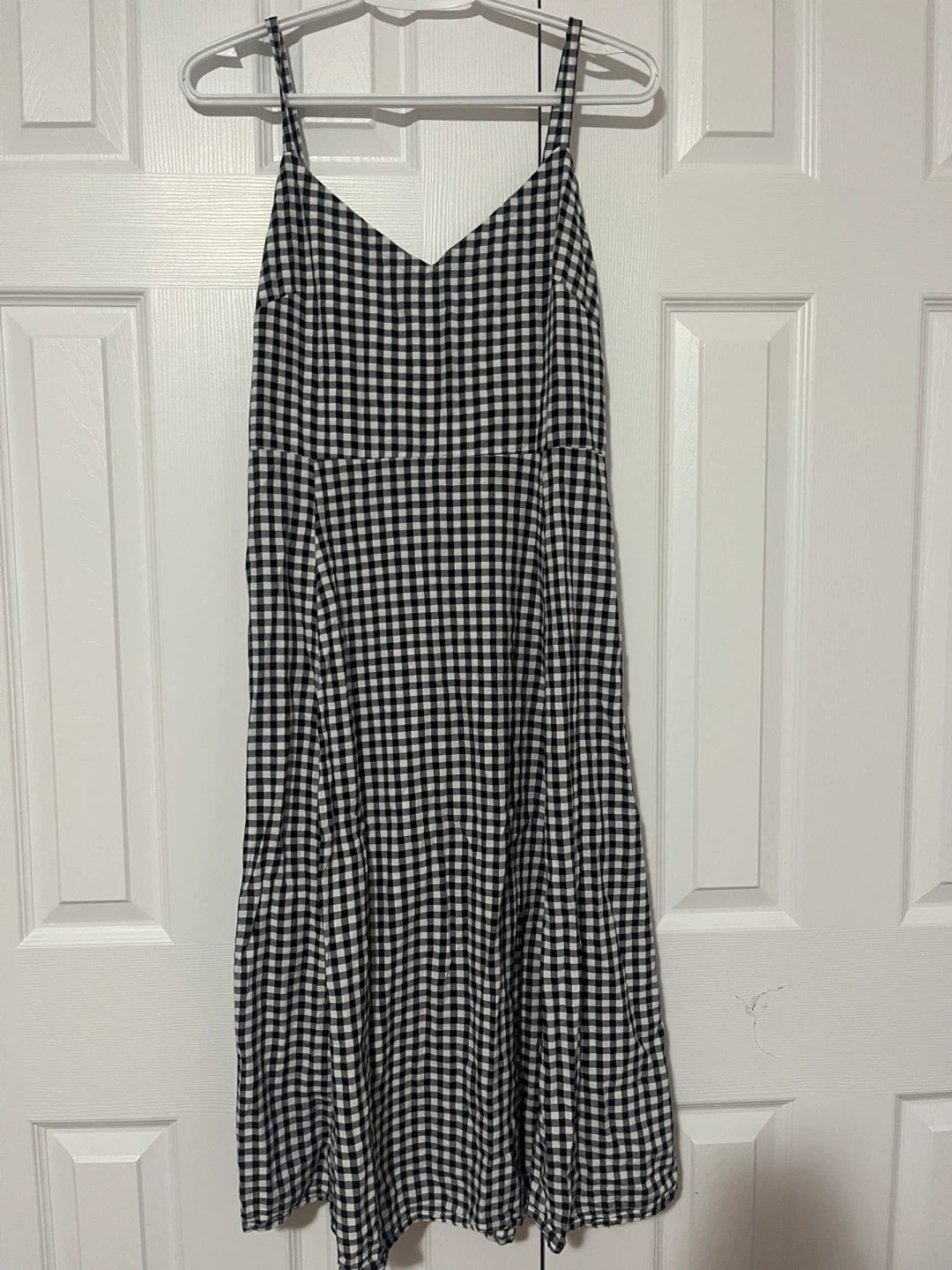 This Gap midi dress features a classic black and white gingham pattern. It's a size medium. It's perfect for sunny days!