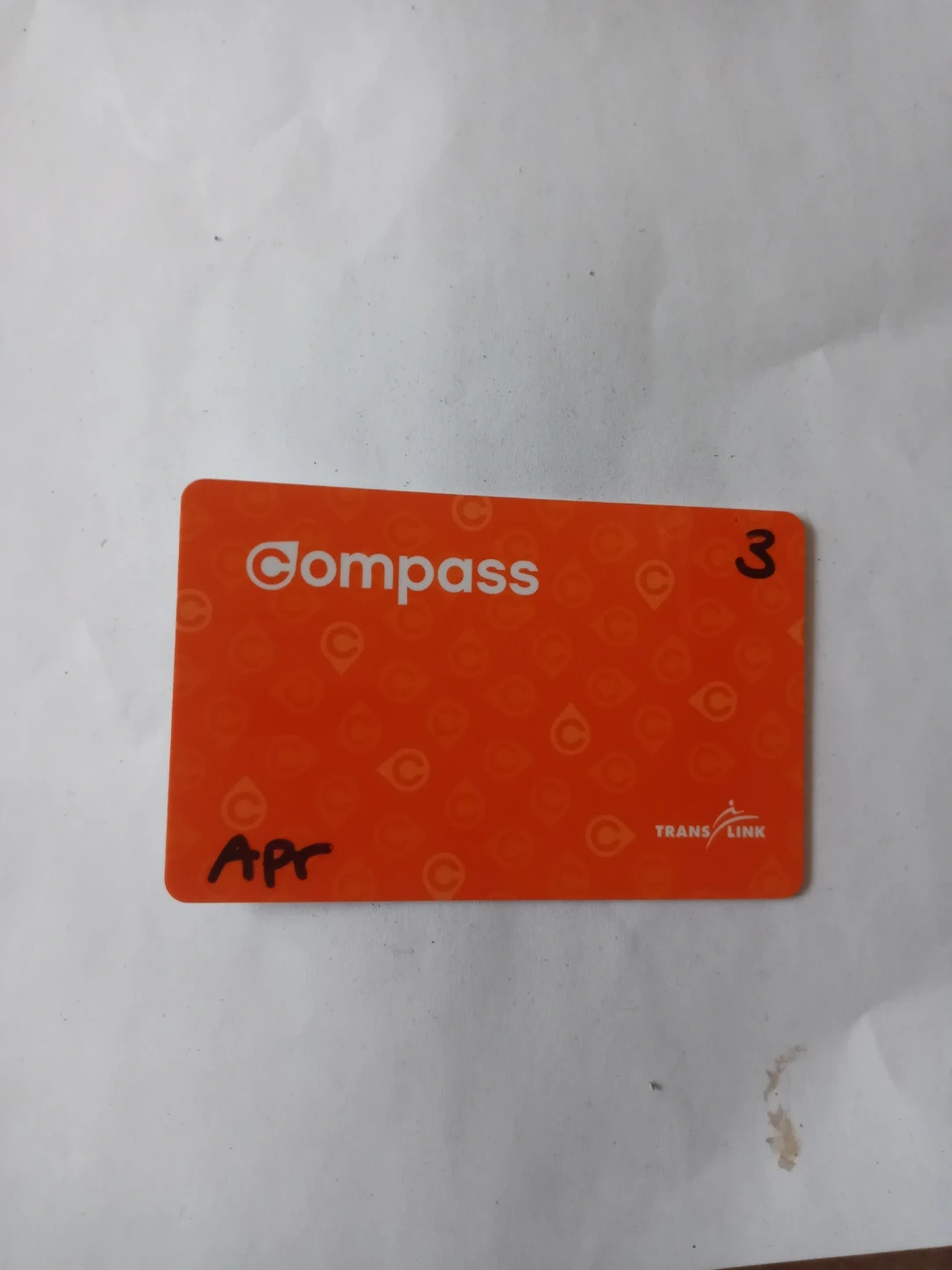 Orange Compass Card for TransLink. The card has 'Apr' written on it in black marker. It's a standard transit card good till the end of april no money louded on it can choose to loud money after or regerster after your choice
