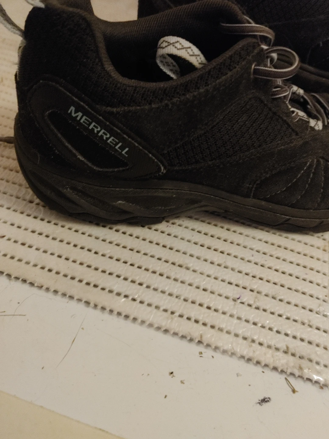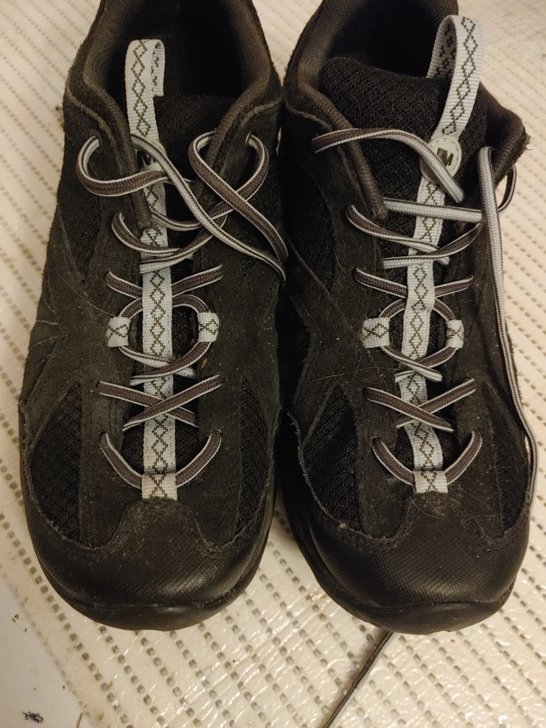 These Merrell shoes are black. They're designed for hiking. Suitable for trails and everyday wear.