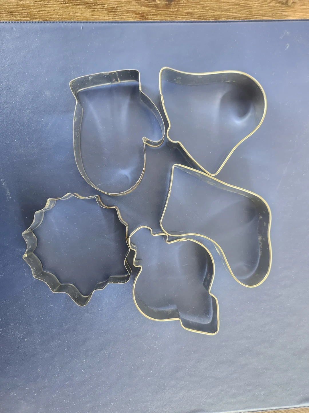 This set includes 5 metal cookie cutters for crafting. in various shapes, including mittens, bell, stocking and a scalloped circle.