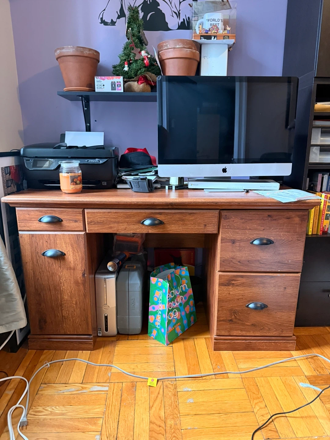 This wooden desk offers ample storage with its multiple drawers. It has a classic design that fits well in any home office. The rich wood finish adds warmth to your workspace.