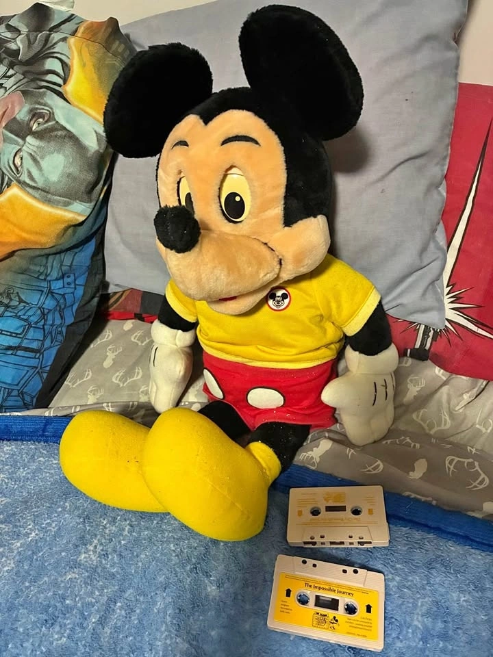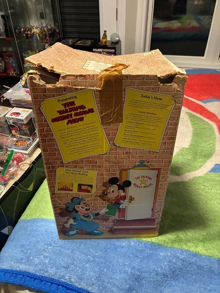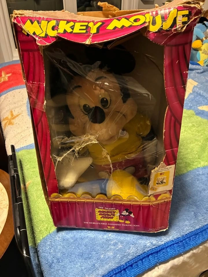 This is a vintage 1986 Talking Mickey Mouse from Worlds of Wonder. The box is damaged and the eyes are yellowed from age. Two taps are included. Sold as is.