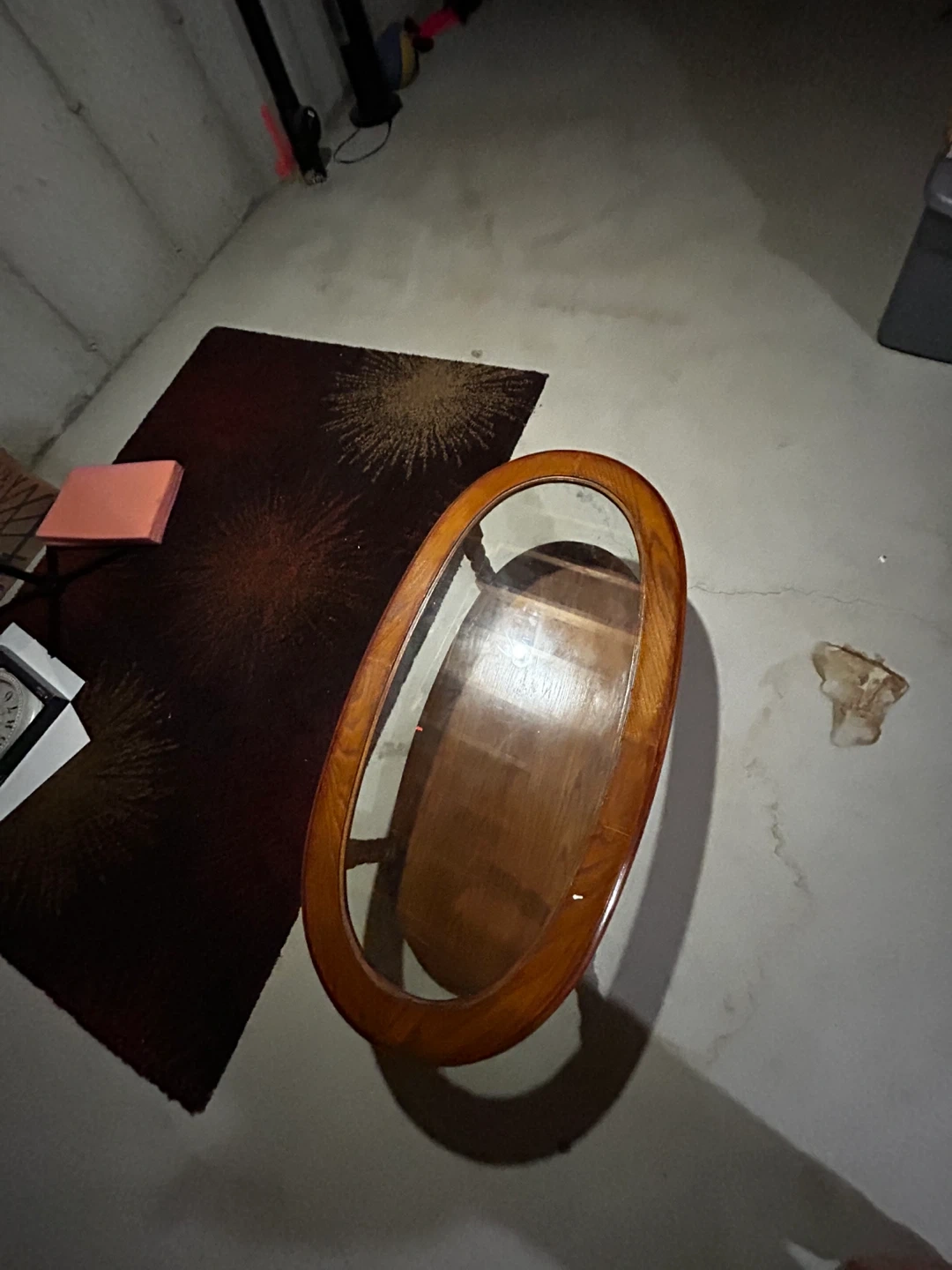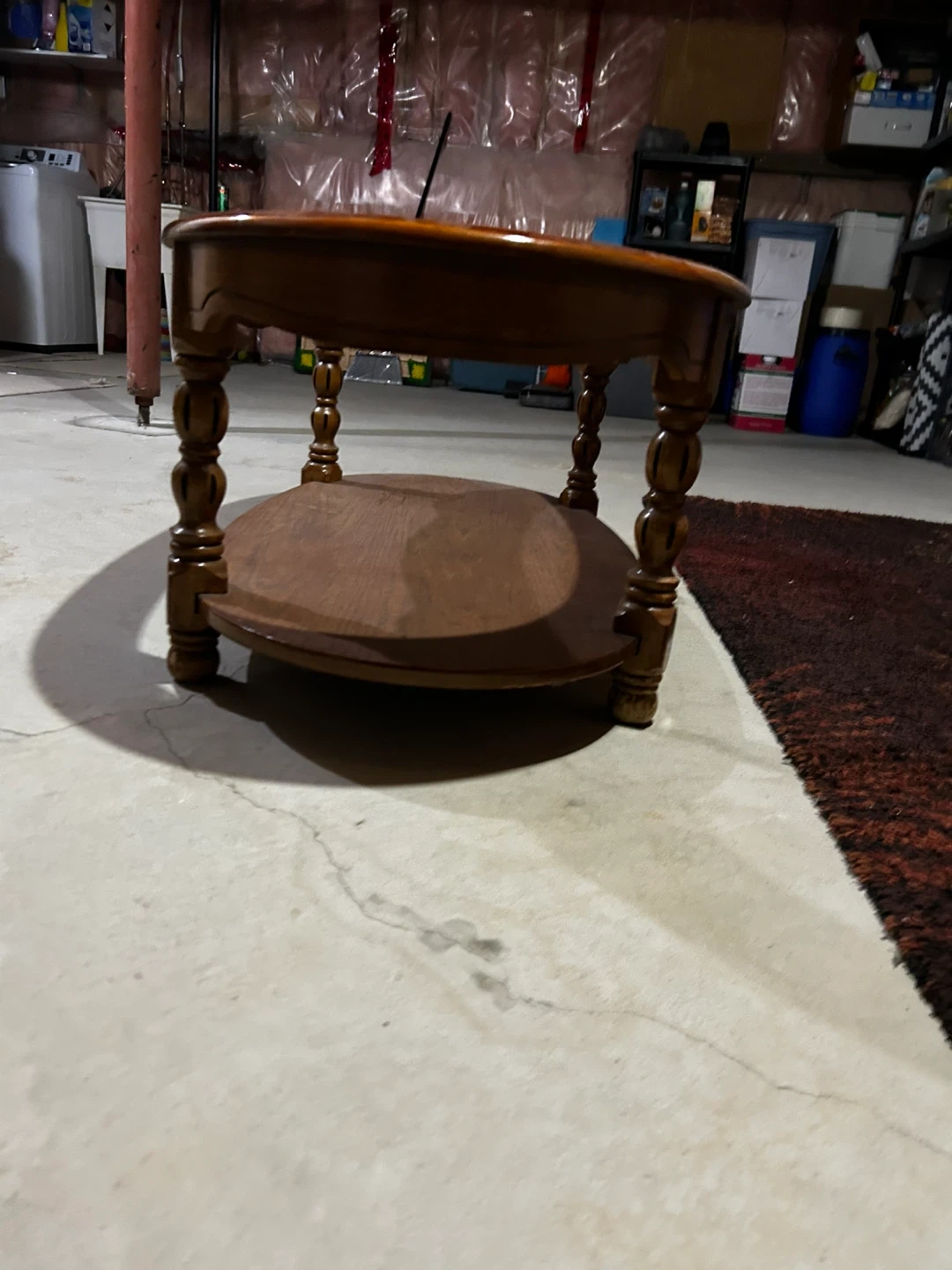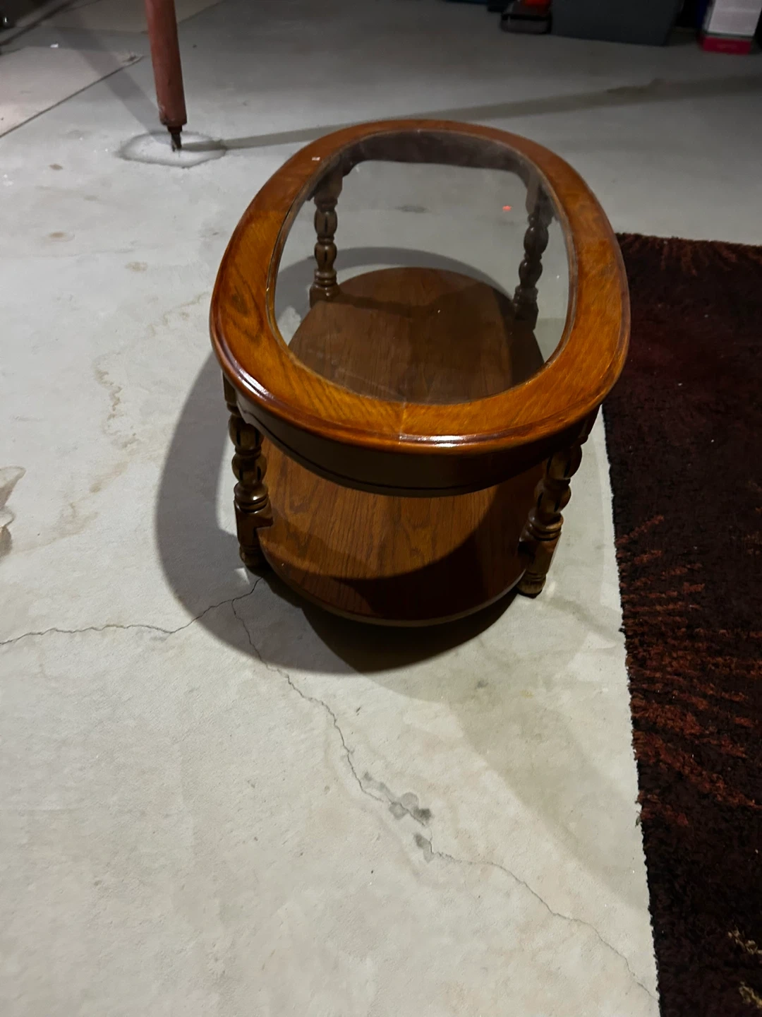 This oval coffee table features a glass top and a solid wood base with a lower shelf. It has a rich wood finish and carved detailing on the legs. Great for adding a classic touch to your living space!