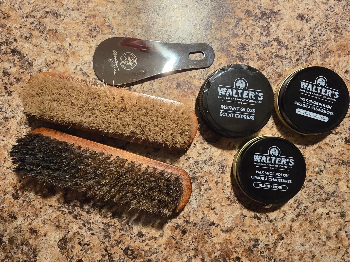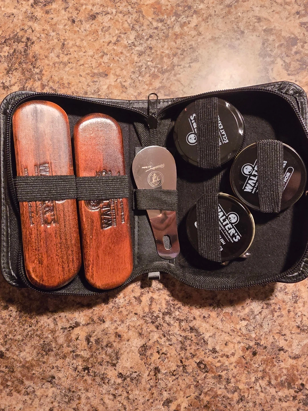 Selling a Walter's shoe shine care kit! It includes two brushes, a metal shoe horn, one instant gloss and two wax shoe polishes. It comes in a convenient carrying case to keep everything organized