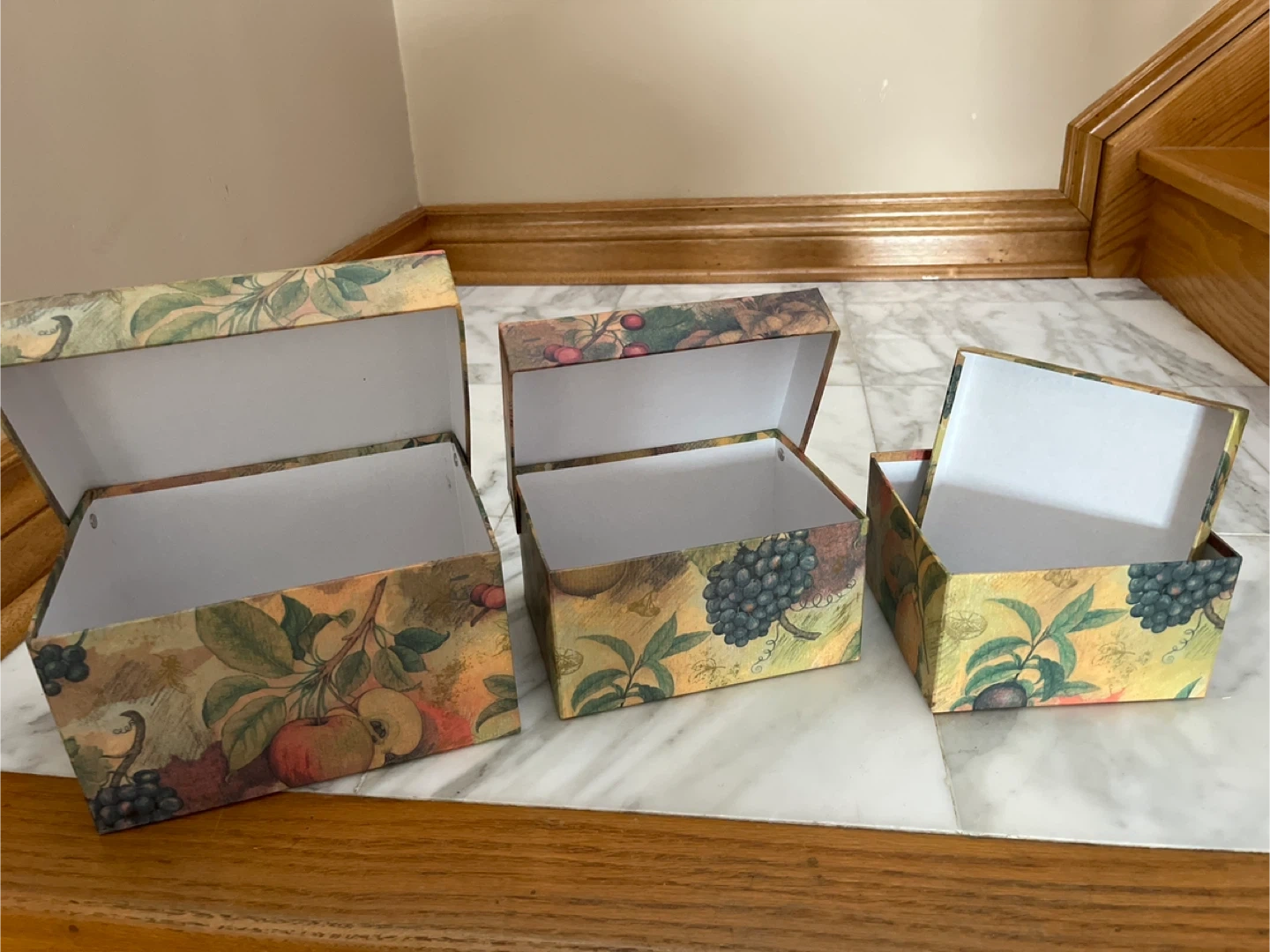 NEW set of three decorative storage boxes. They feature a harvest fruit and vine pattern. Boxes are great for organizing small items. Cash only $10 for set