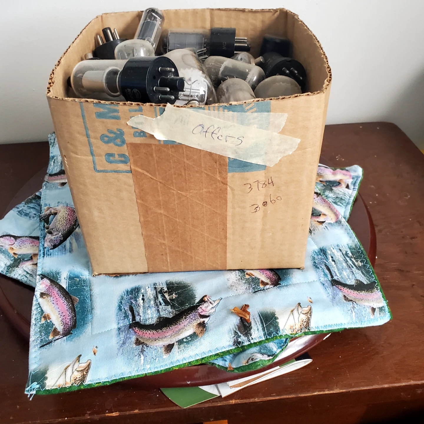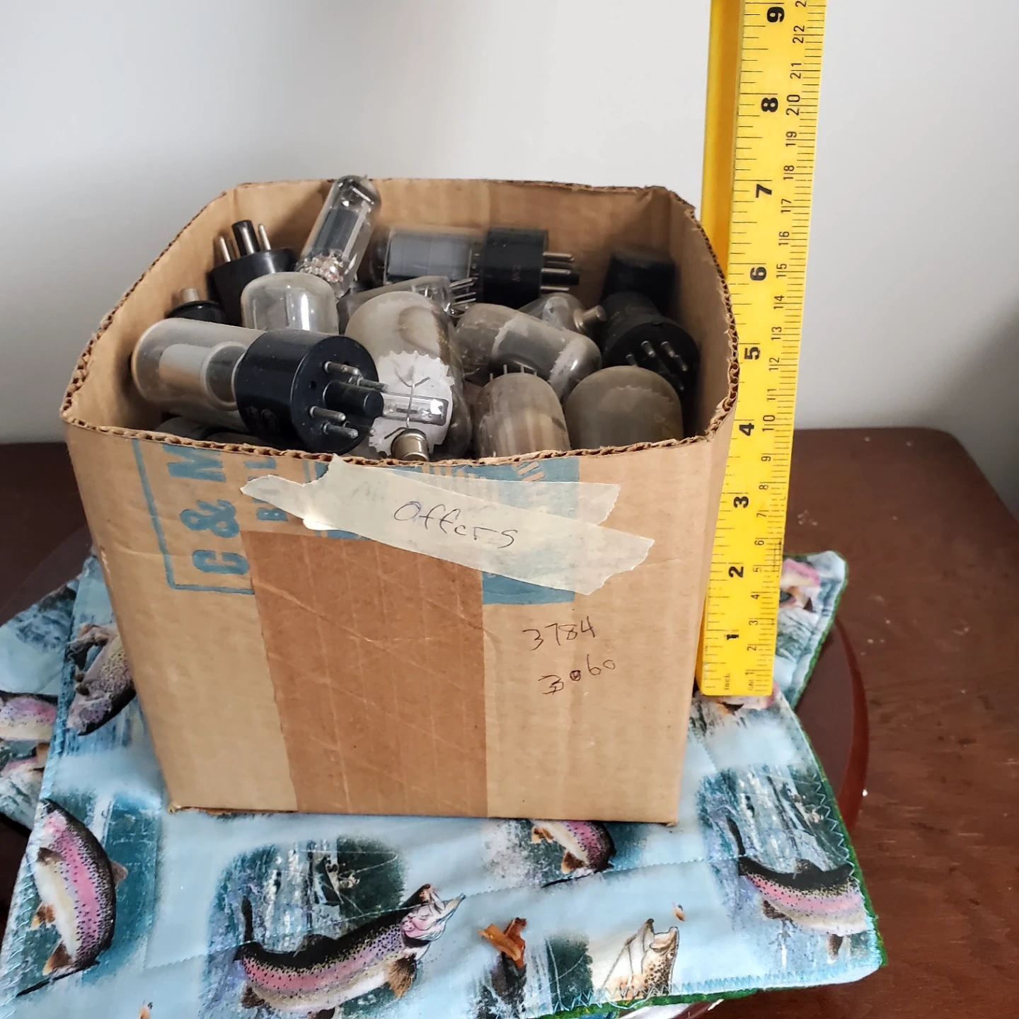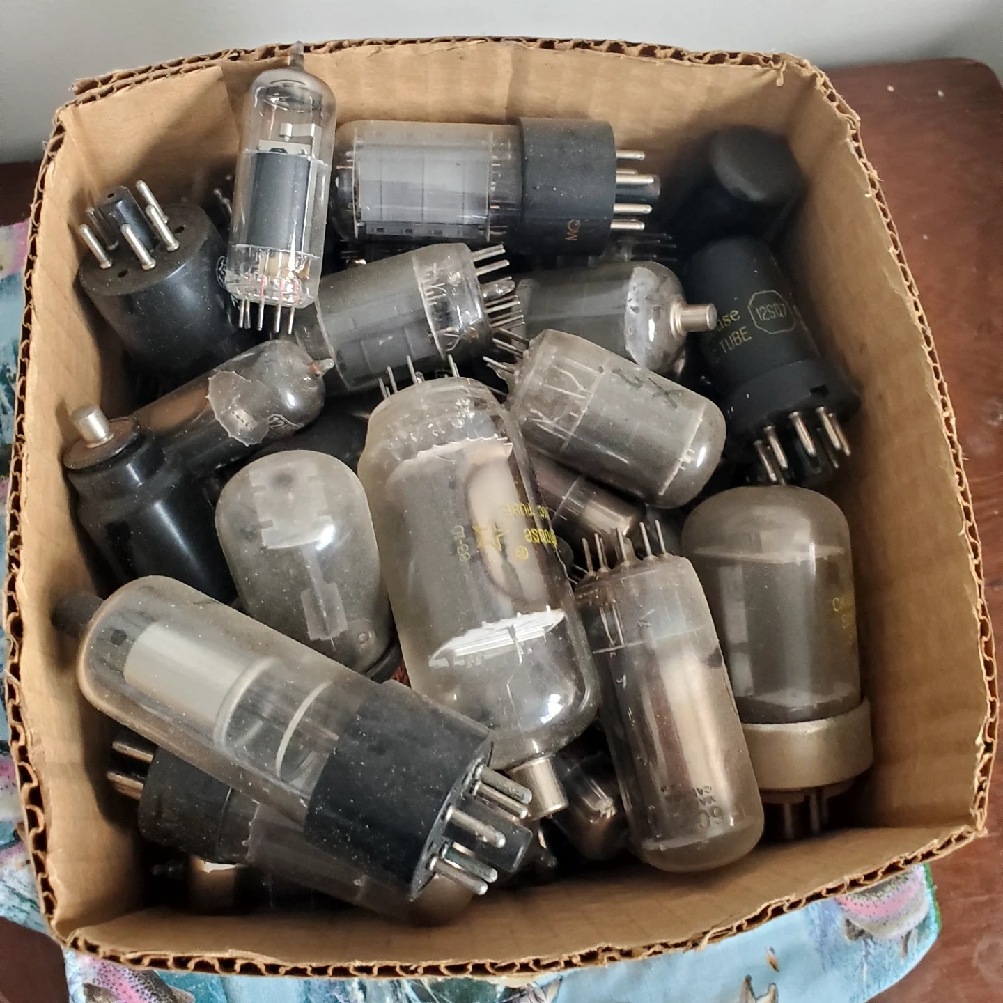 This is a box filled with various vacuum tubes. Many tubes are visible, and some have numbers or lettering on them. This lot is being sold as-is. There's approx 100 + tubes, all would have to be tested..(sold that) but non looked burnt. price is for all and open to offers...lets be nice.