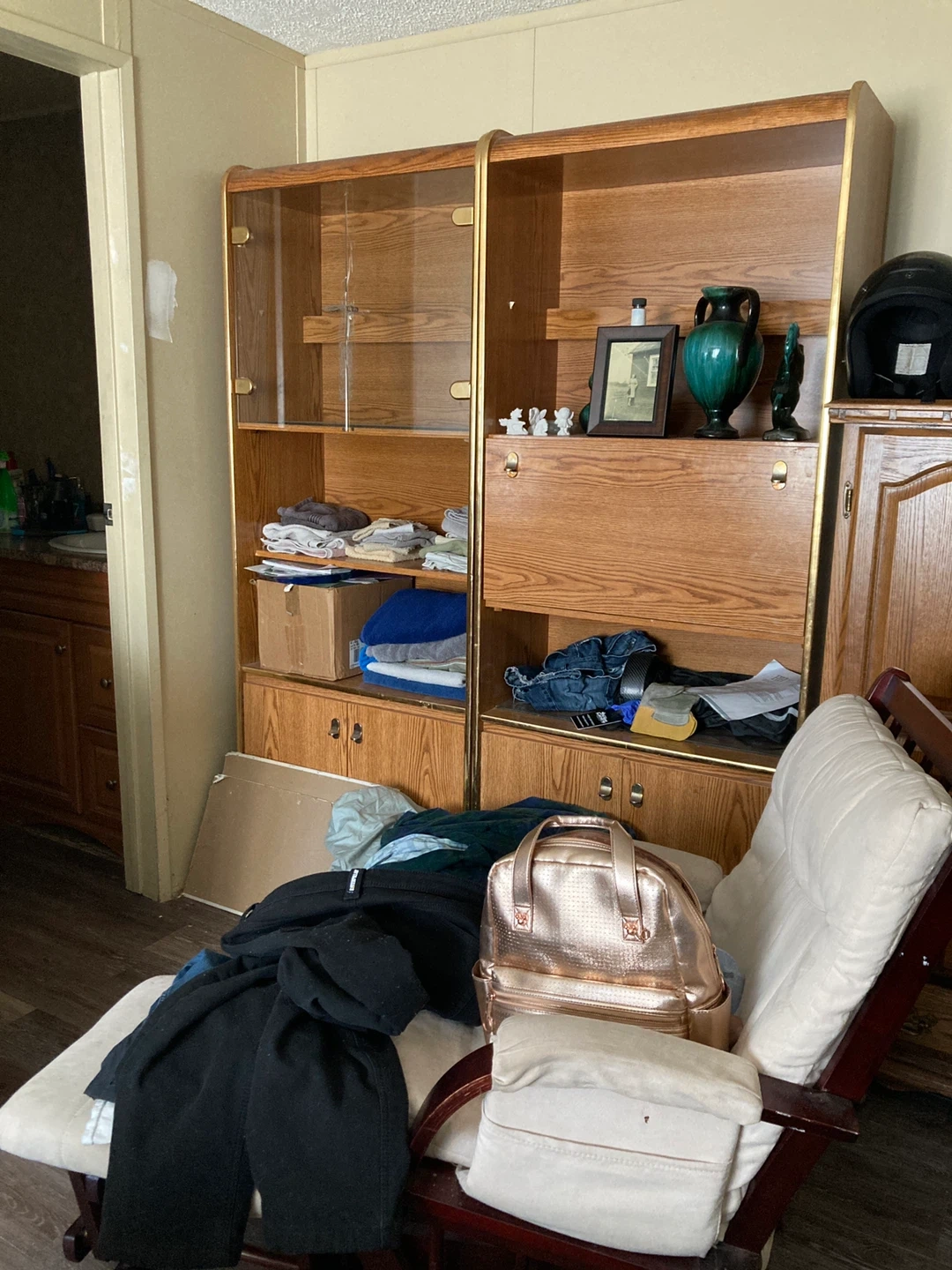 A lovely oak display cabinet featuring glass doors on the left section. It has several shelves and a convenient fold-down desk area. Some decorative items and clothing are visible inside. It's a sturdy piece of furniture perfect for storage or display! Call Jim. At 825-772-9200