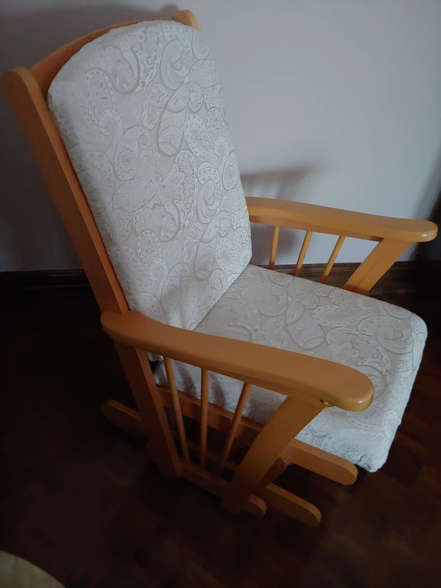 Lightly used wooden rocking chair, perfect for relaxing. The cushions are in great shape and very comfortable. They have been recovered. Great addition to any living room or nursery!