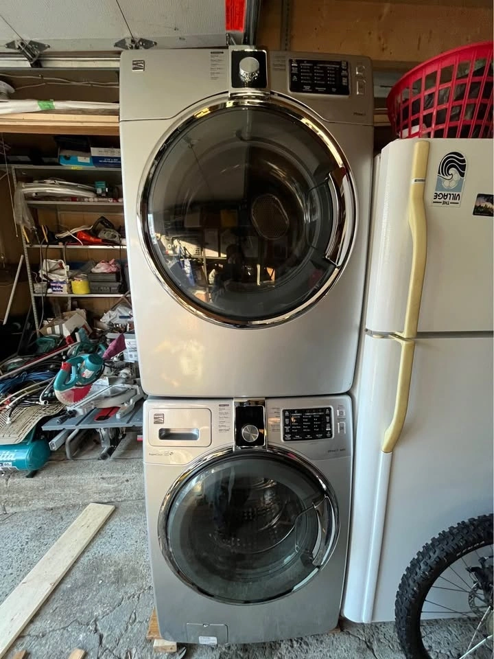 Great condition Kenmore front-loading washer and dryer set. The washer has various cycle options and a large capacity drum. The dryer has multiple heat settings and a steam function. Both appliances are electric and have a modern design. Feel free to message if you have any questions!