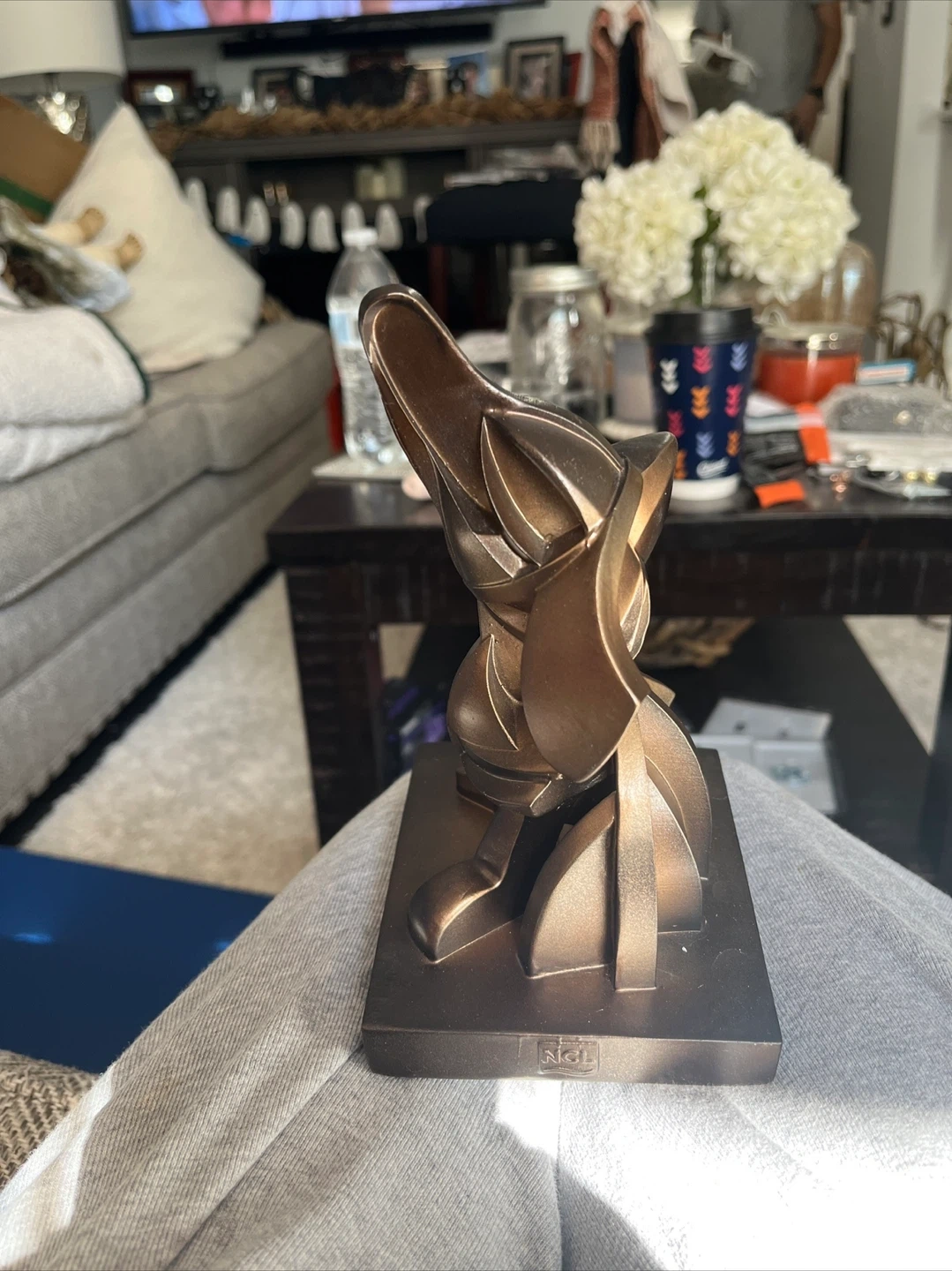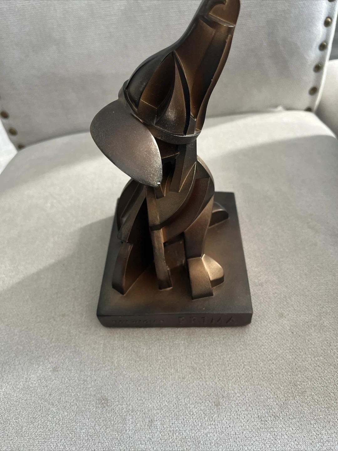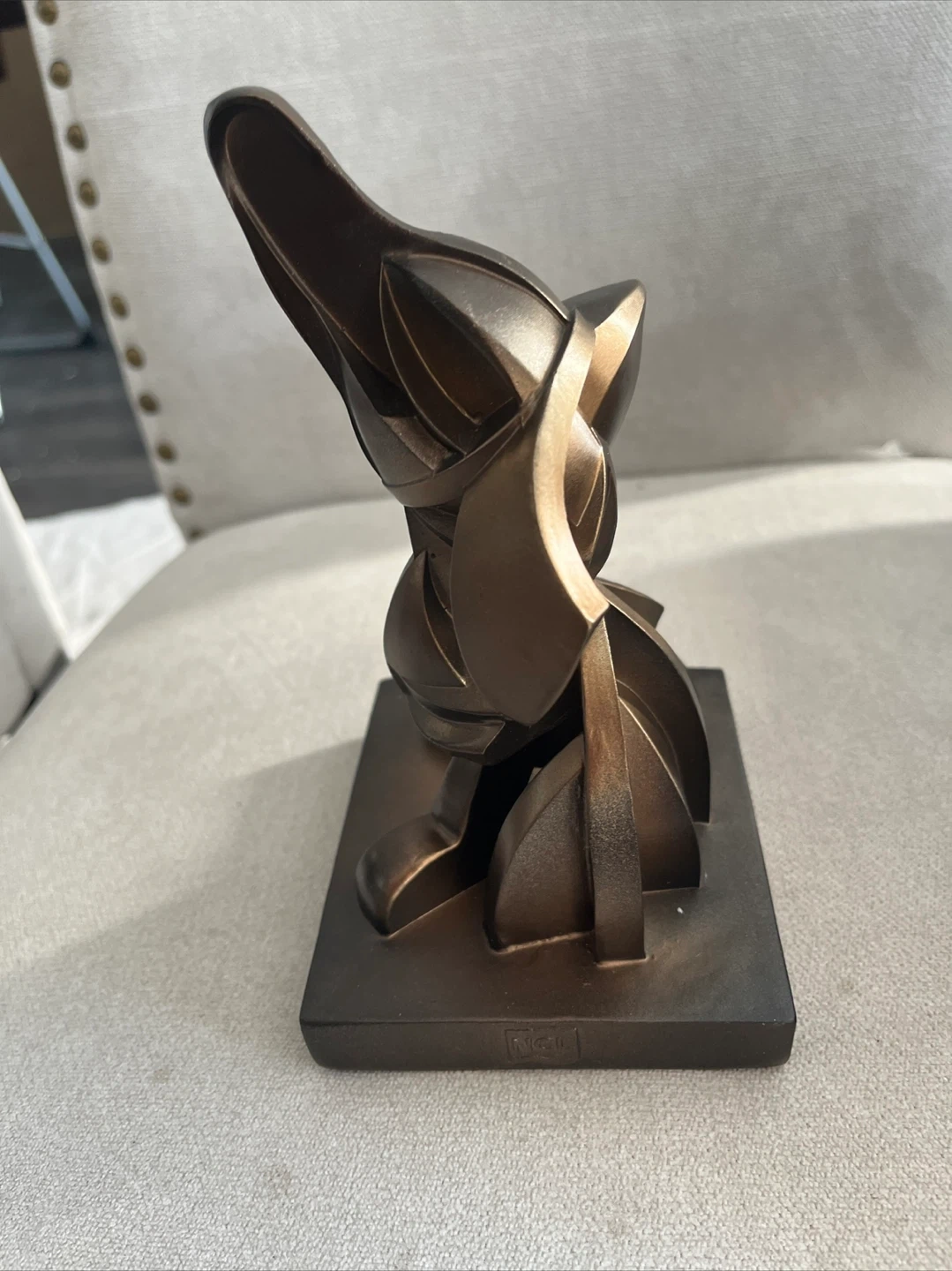 This is a bronze abstract sculpture figurine. It's designed in a modern, geometric style. The piece has a metallic bronze finish. It's a decorative item that would work well on a shelf or desk.