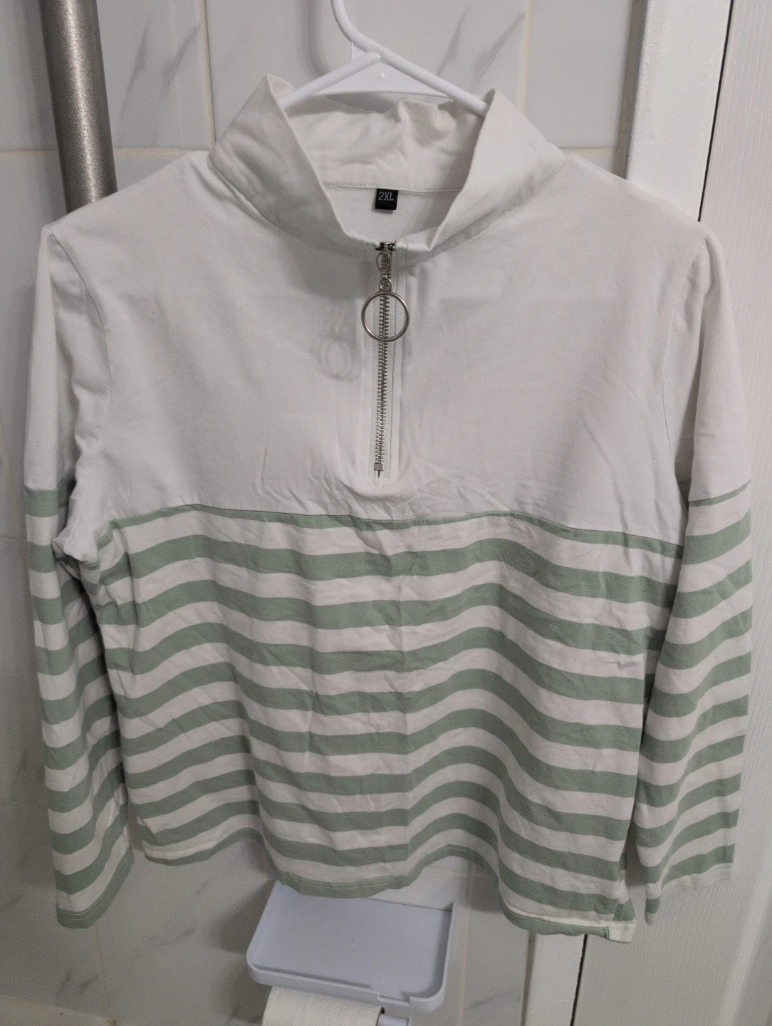 A white and mint green striped long sleeve top with a 1/4 zipper and mock neck. It's a size 2XL. This top offers a relaxed fit for everyday wear.