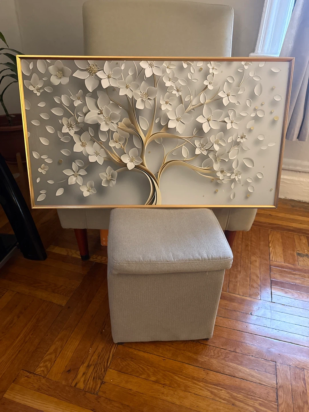 Add a touch of elegance to your home with this stunning 3D canvas wall art. It features a beautiful white cherry blossom tree design with intricate details and a shimmering gold frame. This piece will surely be a conversation starter!