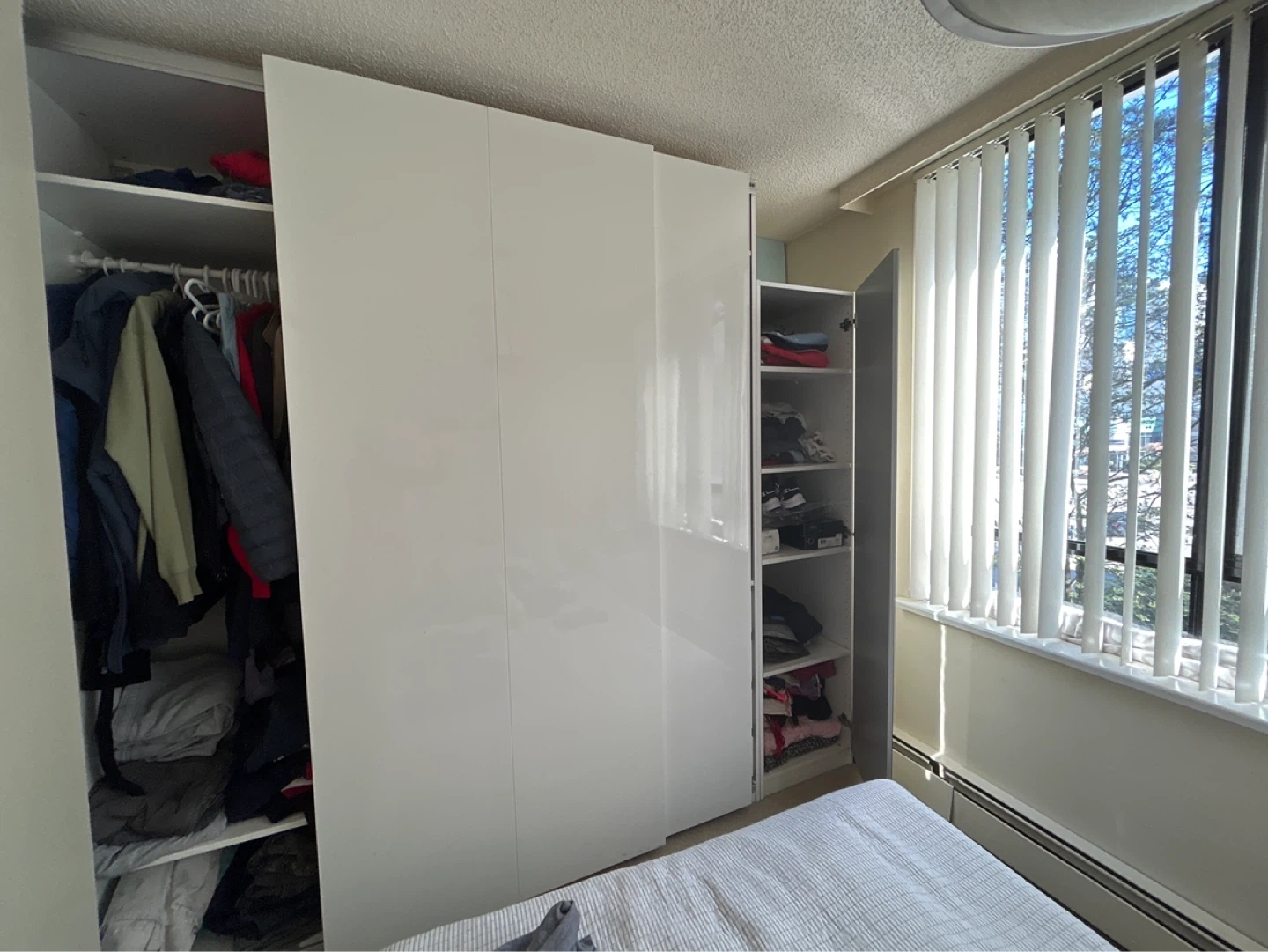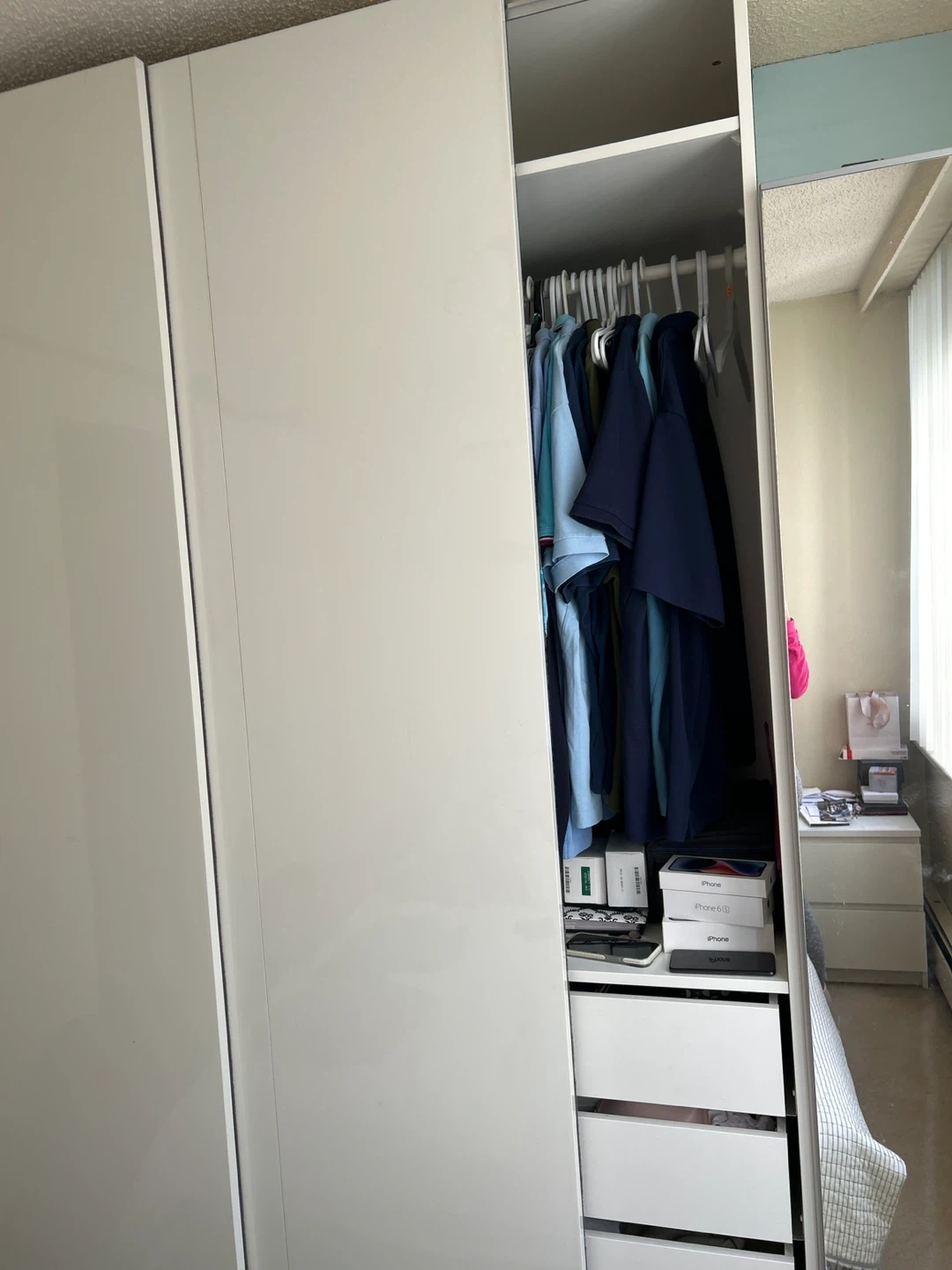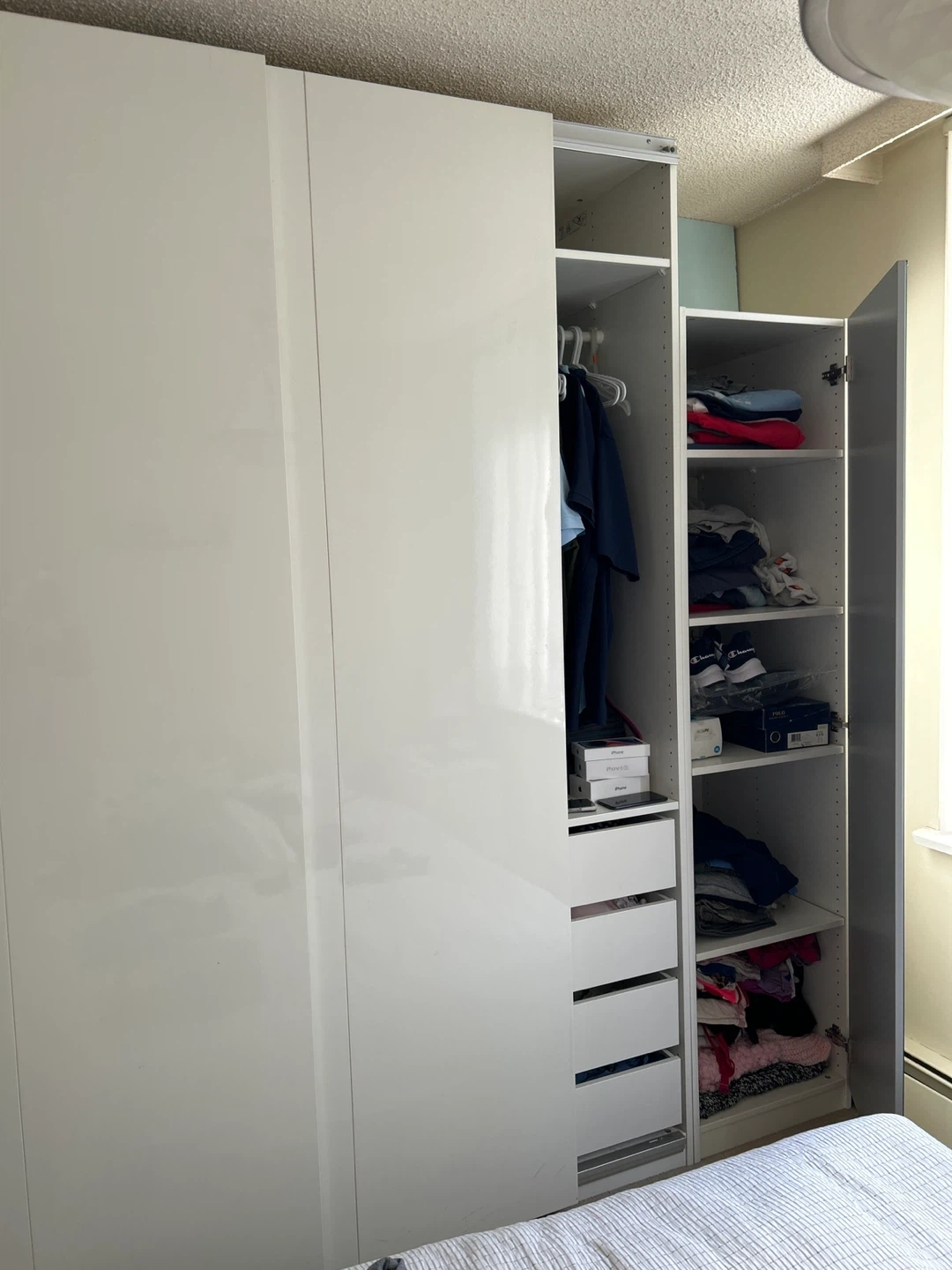 This is a large IKEA PAX wardrobe system featuring smooth sliding doors. It includes ample hanging space, shelves, and drawers for all your storage needs. It's a great solution for organizing clothes and accessories in your bedroom.