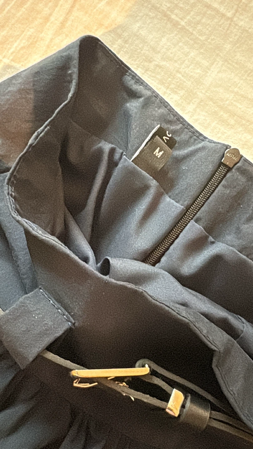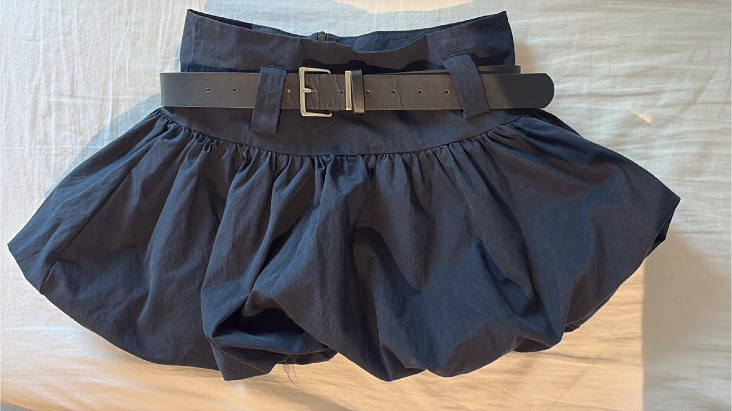 Navy blue bubble skirt with a black faux leather belt. It's a size medium with a zippered back. Material appears to be polyester.
