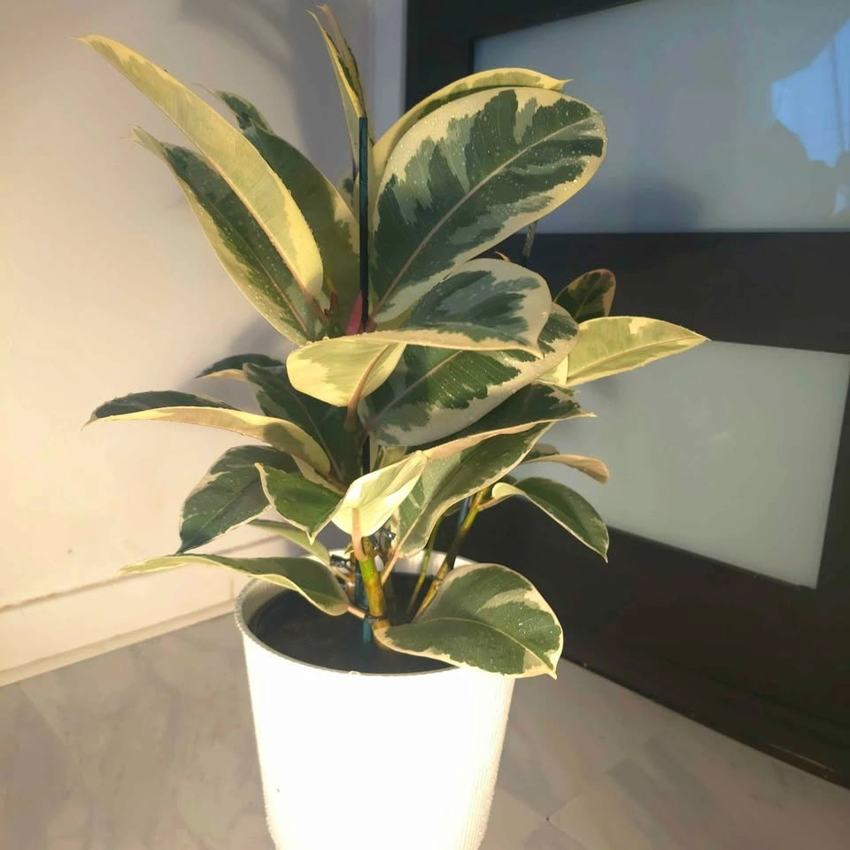 Real Rubber Tree in a 10" nursery pot with a white decorative cover. This plant is 3.4' tall and 2.11' wide, and will continue to grow in this pot. Pick-up in North Vancouver.