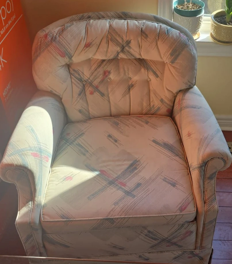 MOVING OUT SALE This is a classic vintage tufted sofa and armchair set. The sofa is a three-seater with rolled arms and button tufting. The armchairs is upholstered in a patterned fabric. Both pieces have wooden trim and legs. They're a lovely set for a living room!