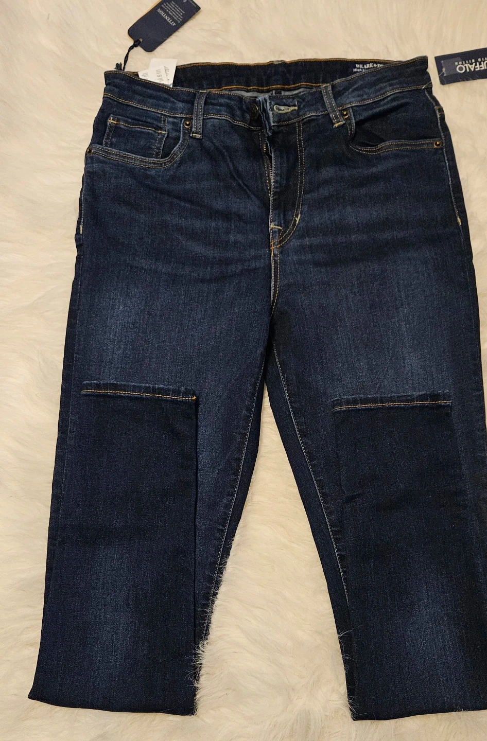 Two pairs of Buffalo Jeans in a dark wash. These are a high-rise, Skinny/Skylar fit style. Made from a durable denim material.