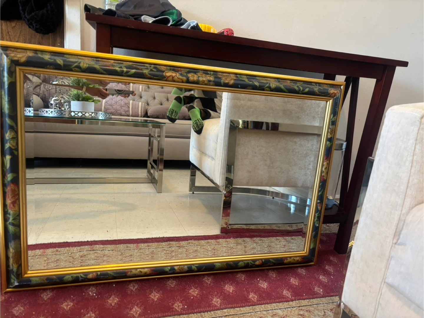 A decorative rectangular mirror featuring a black frame with a gold trim and a detailed floral design. It's suitable for adding a touch of elegance to any room. This mirror would be a lovely accent piece in a hallway or living space.
