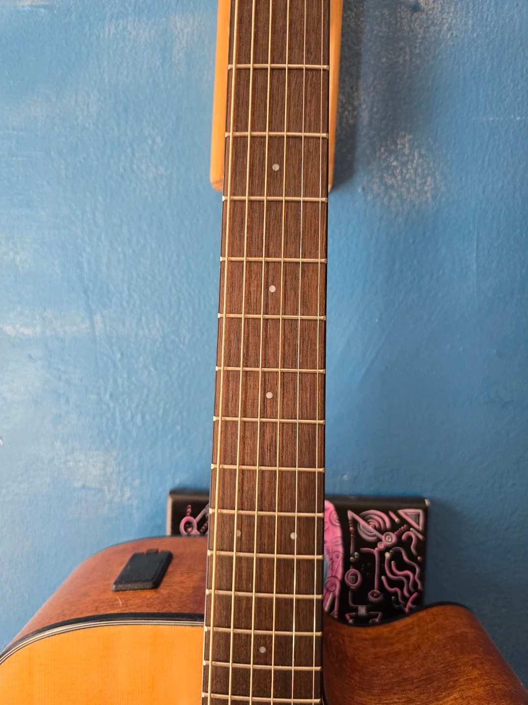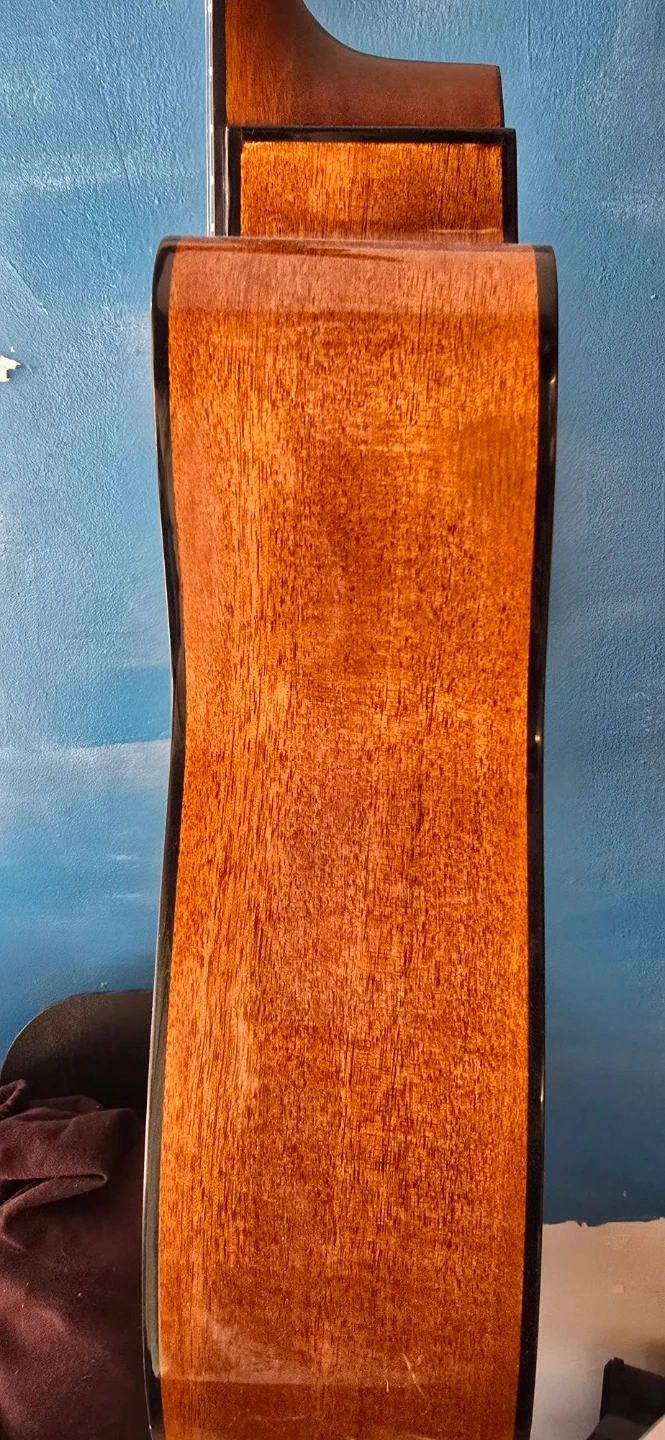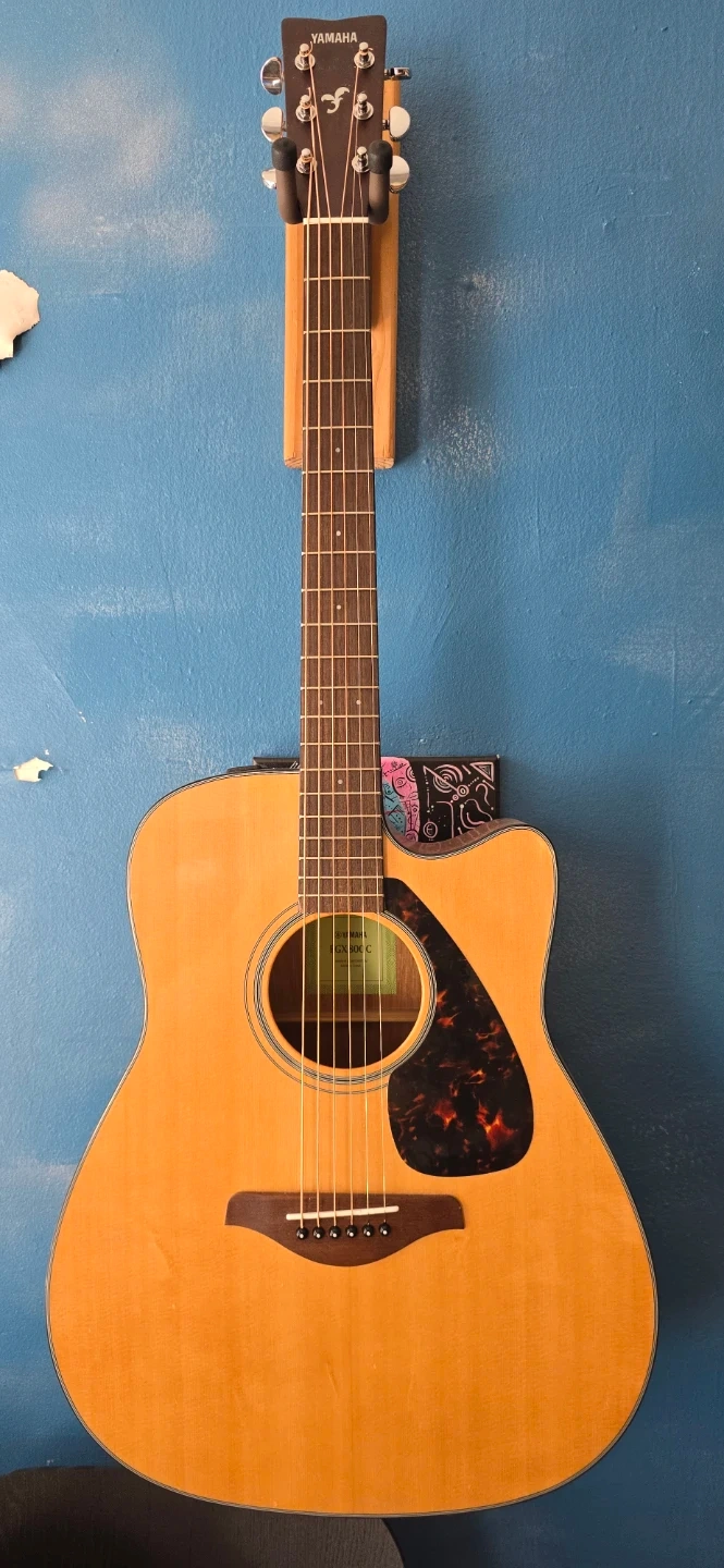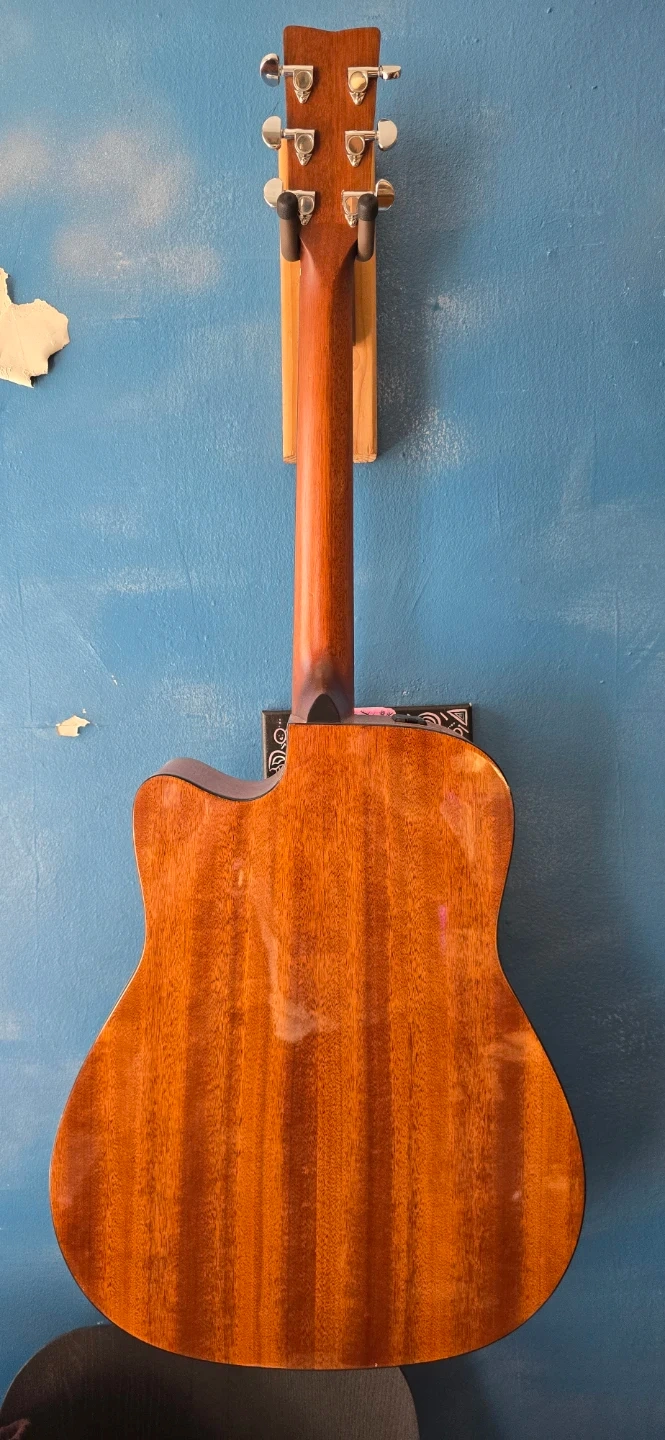 This is a Yamaha FG800C acoustic guitar. It features a dreadnought body with a cutaway for easier access to higher frets. The top is solid spruce, and the back and sides are nato wood. It has a rosewood fingerboard and bridge. This guitar produces a warm and balanced tone.