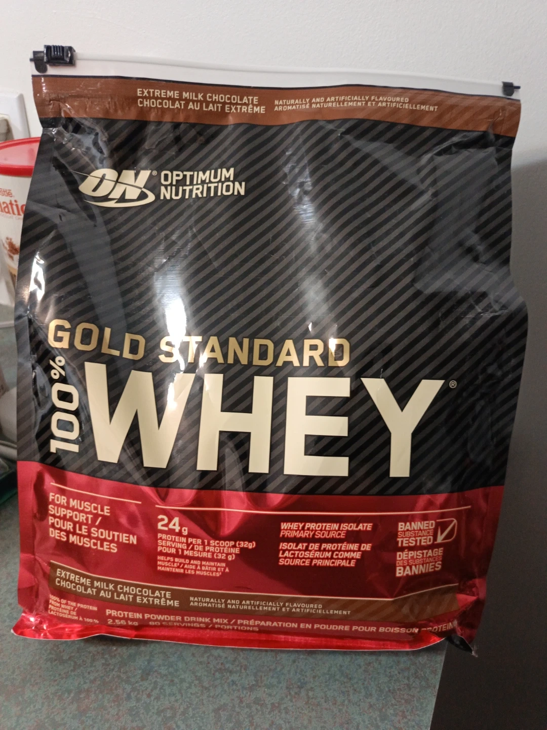 This is a 2.56 kg bag of Optimum Nutrition Gold Standard 100% Whey protein powder in Extreme Milk Chocolate flavour. It's a protein powder drink mix designed for muscle support. Each 32g scoop provides 24g of whey protein isolate, which is the primary protein source.