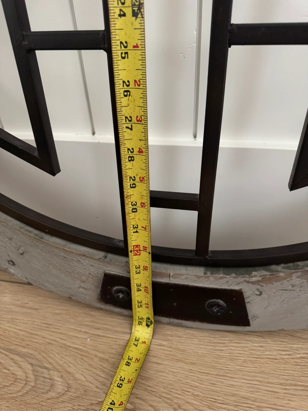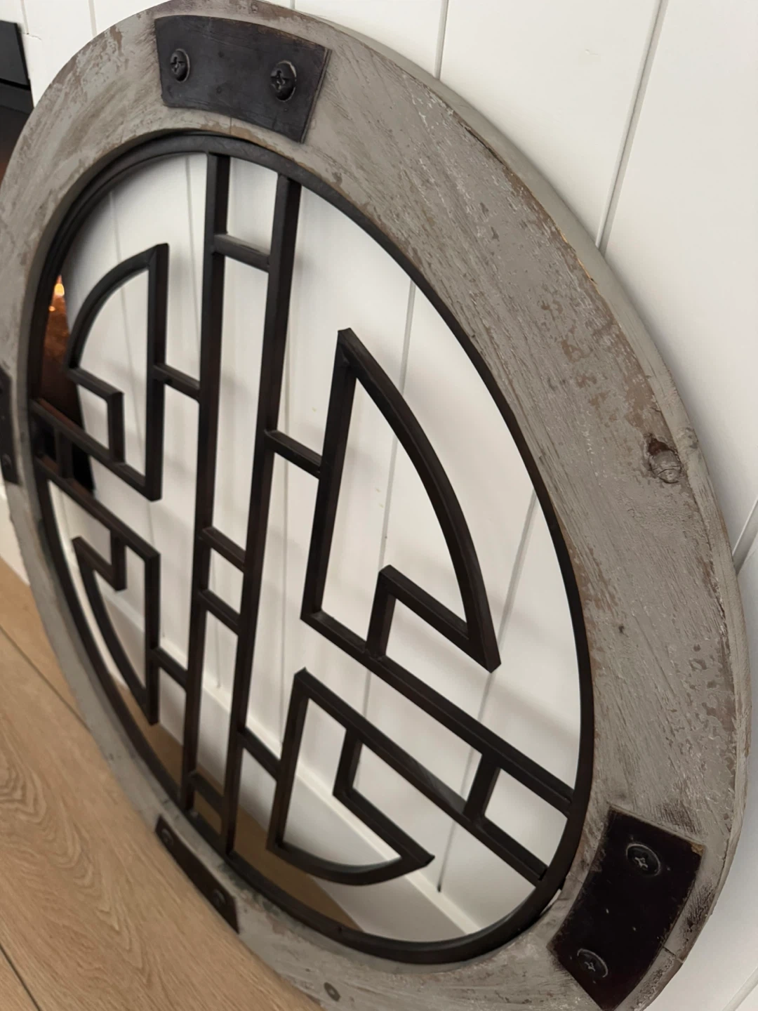 Circular wall art with a distressed grey wood frame and a black metal geometric insert. Looks heavy but is light.