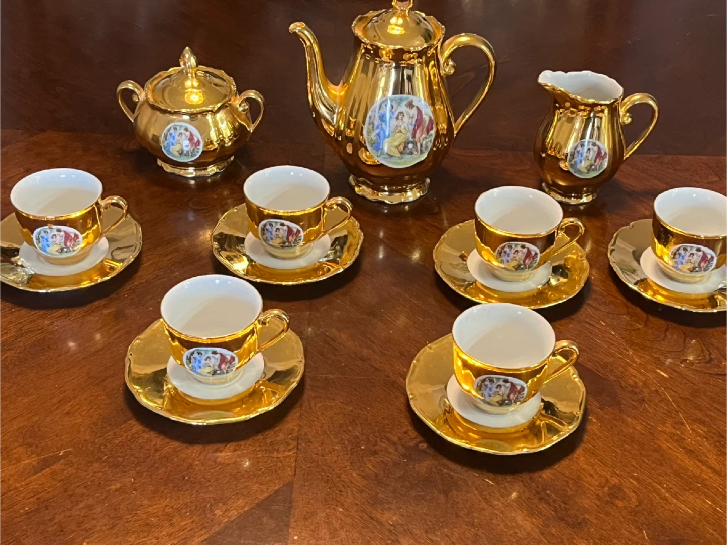 Selling a beautiful gold tea set made by Epiag in Czechoslovakia. The set includes a teapot, sugar bowl, creamer, and 6 cups and saucers. It has a lovely design with figures on each piece. Perfect for adding a touch of elegance to your tea time