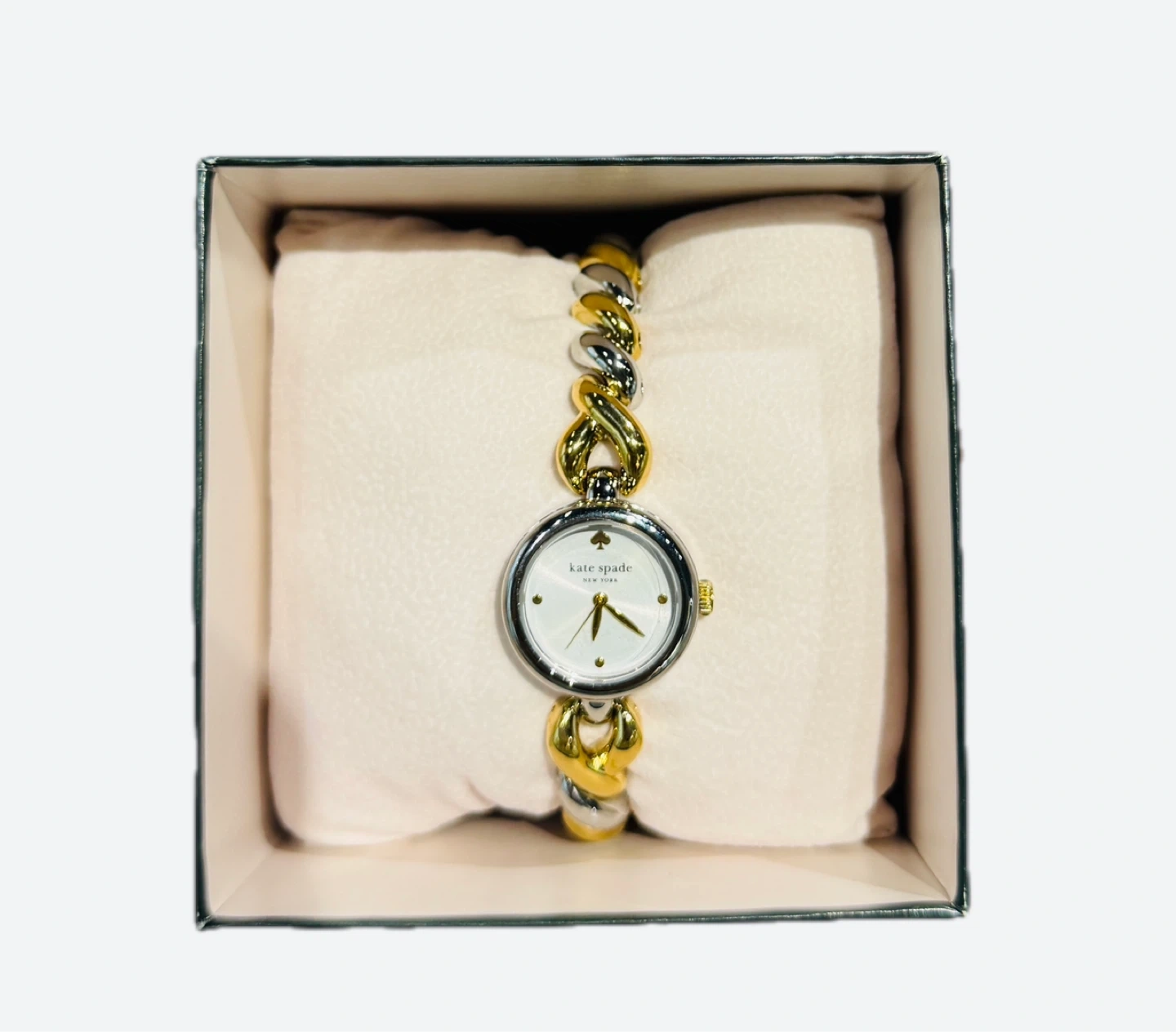 This is a Kate Spade New York women's watch with a two-tone gold and silver link band. It features a white dial with gold-tone hands. The watch comes in its original box.