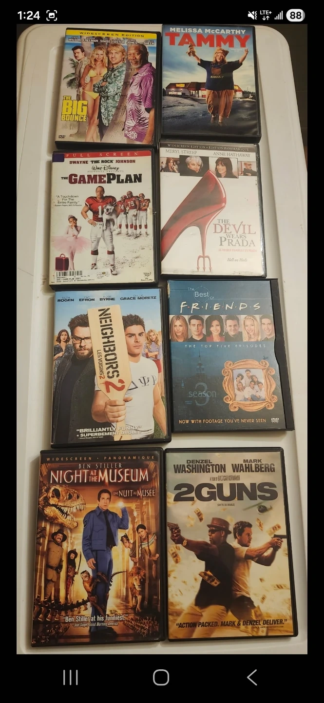 Includes a variety of genres from action to comedy and drama. Titles range from The Fast and the Furious series to Friends, Sex and the City, and many more. Most appear to be in standard DVD .