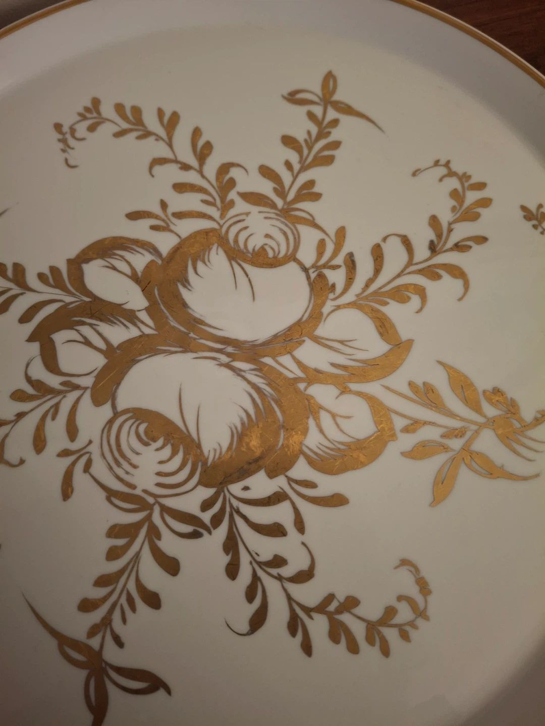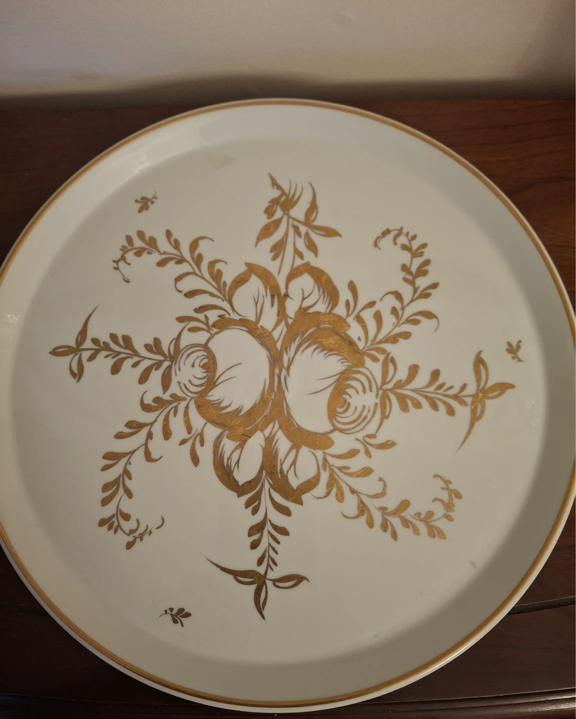 Vintage gold and white plate. Has an hightened edge with fine gold border. Hand painted, made in France. Originally purchased from Birks. 10.75”. A bit of the gold detail has fine scratches as shown in photos.