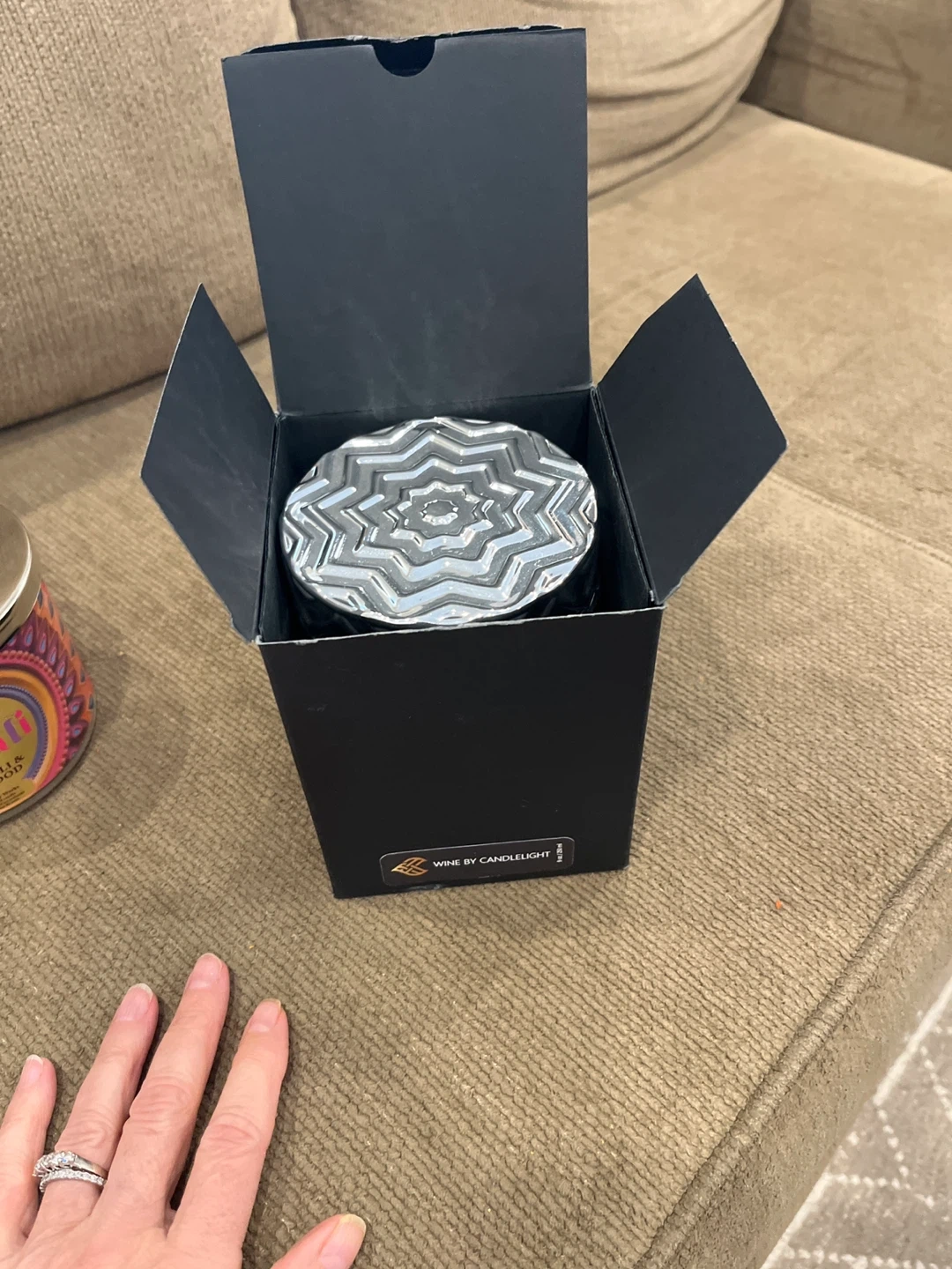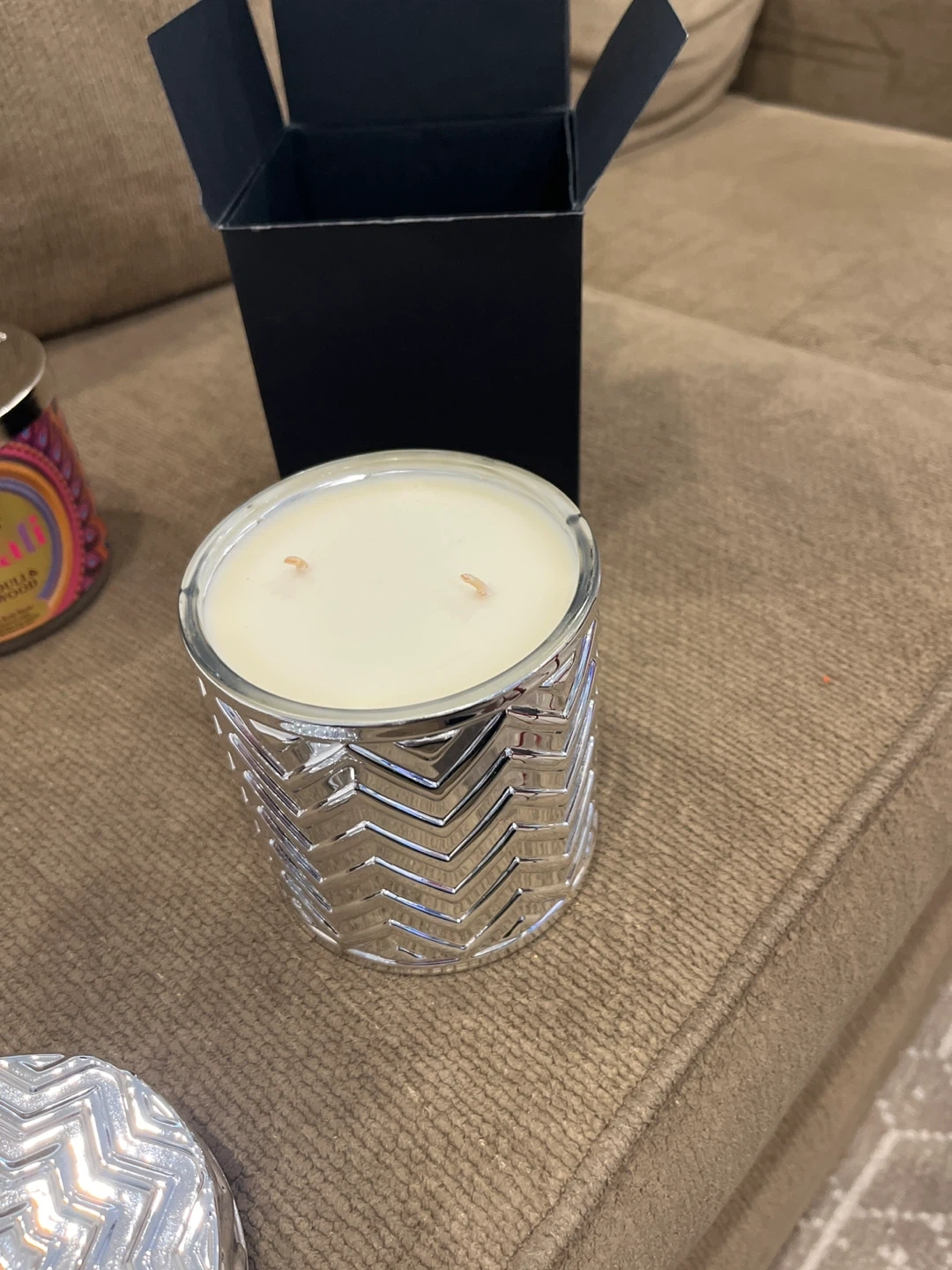 This decorative candle from Flame comes in a shiny silver textured jar with a matching lid. It's a lovely addition to any room. The candle has two wicks.