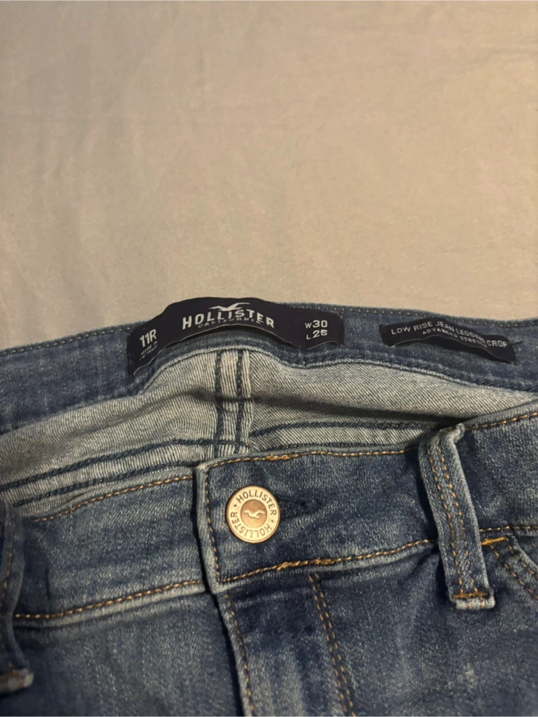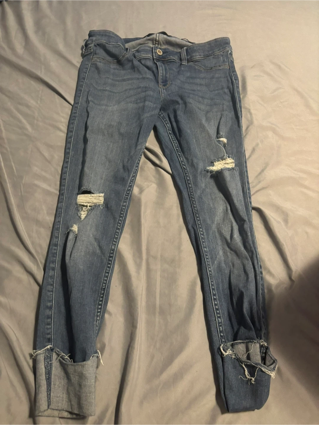 These are Hollister low-rise, ripped jeans. They're a size W30 L25. The cuffs are rolled up.