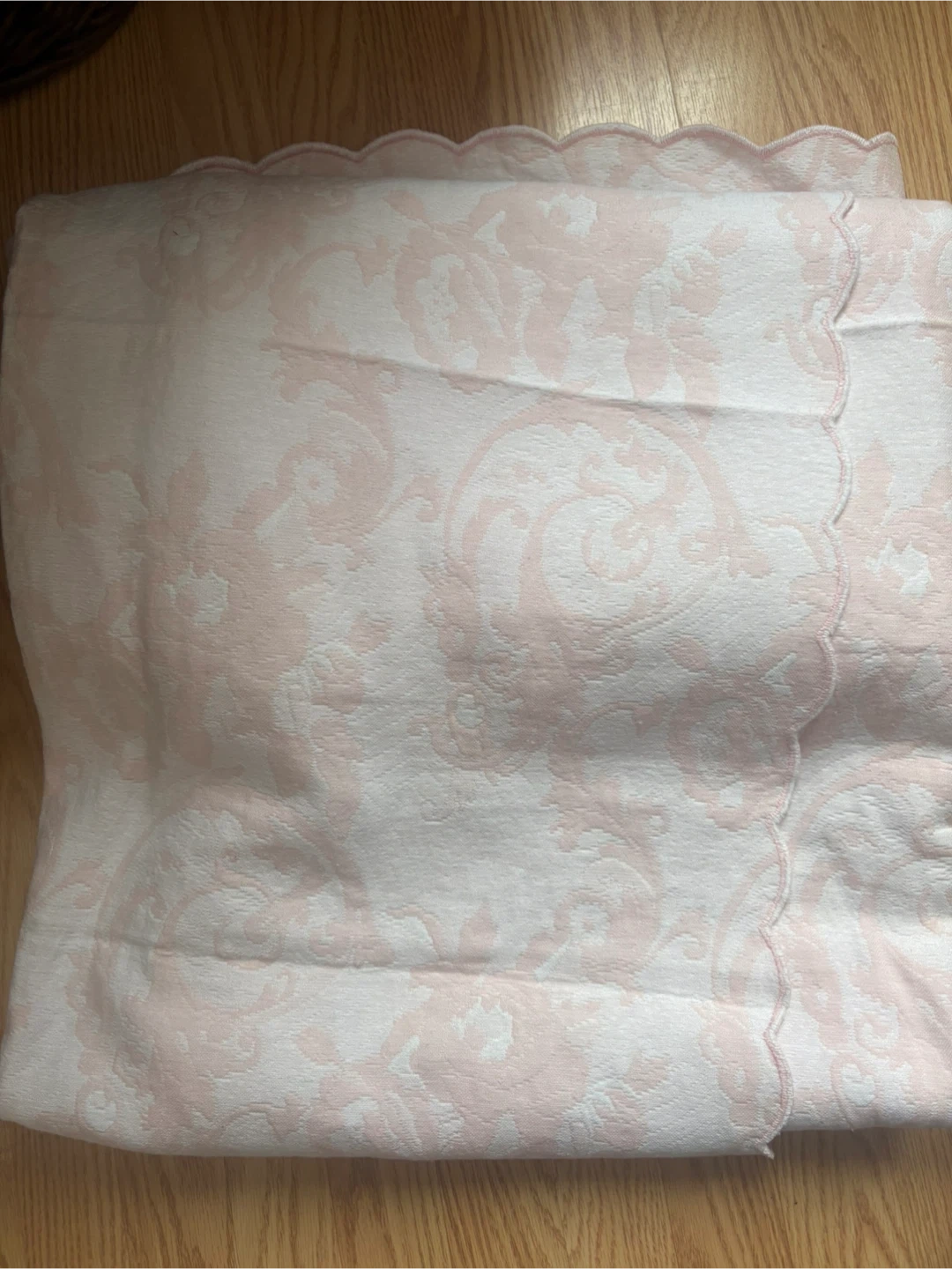 This fabric has a lovely pale pink damask pattern on a white background. It features a decorative scalloped edge, perfect for crafting or home decor projects. The material appears to be a durable polyester blend.