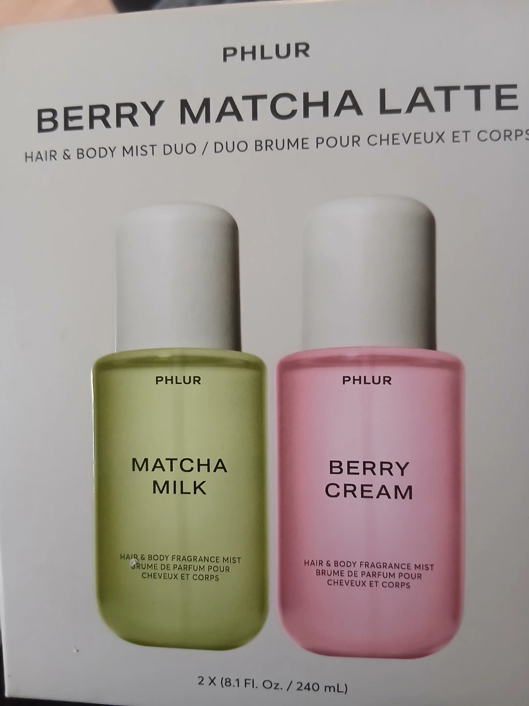 PHLUR Berry Matcha Latte Hair & Body Mist Duo. Includes Matcha Milk and Berry Cream scents. Two 8.1 Fl. Oz. bottles for a total of 240 mL. These mists are for hair and body.