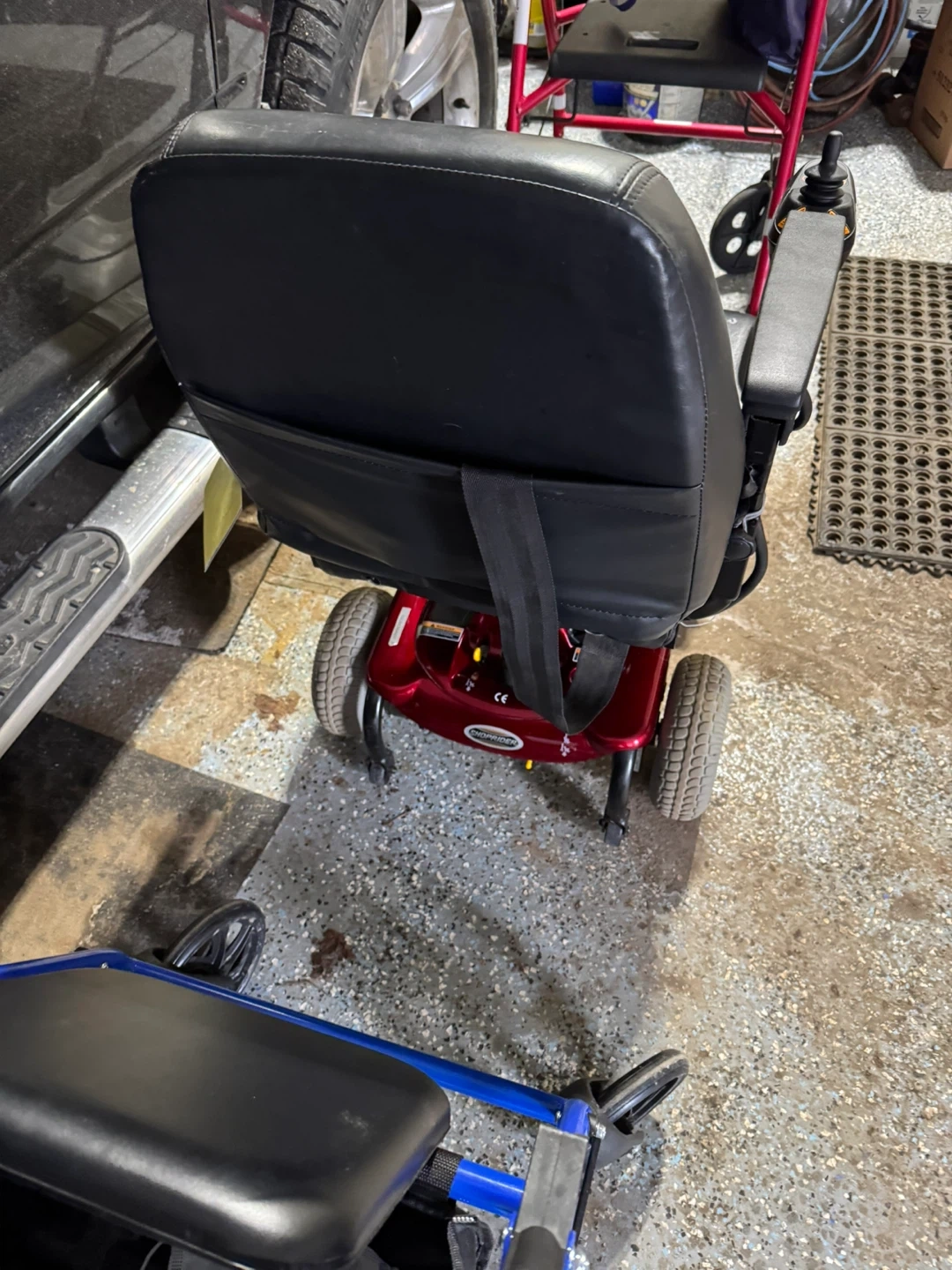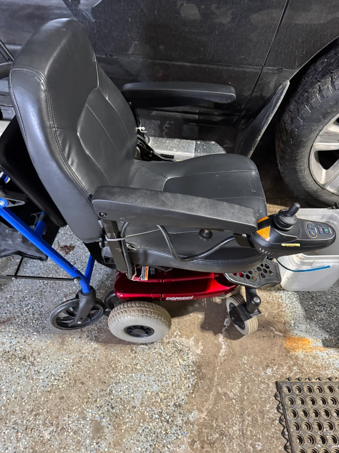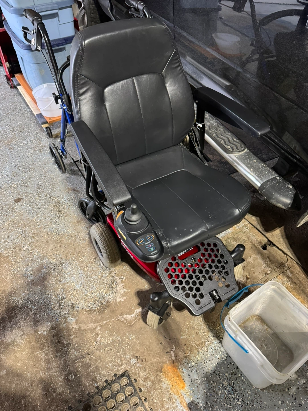 Used Shop rider axis power wheelchair with black leather upholstery. It features adjustable armrests and a joystick controller. This chair is red and black.