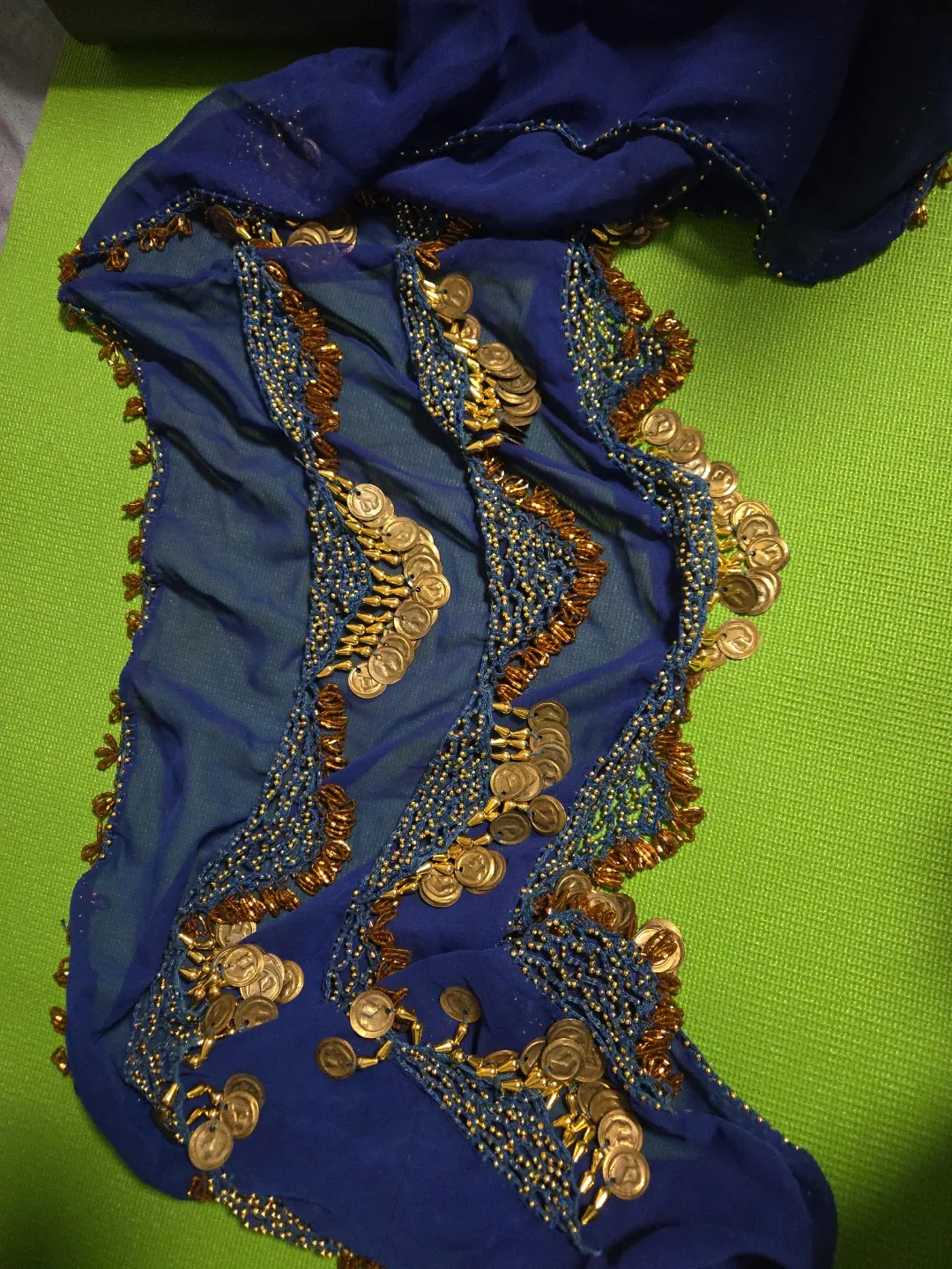 This is a vibrant blue hip scarf designed for belly dancing. It's adorned with numerous gold coins and beadwork that jingle when you move. The material is a sheer, lightweight fabric.