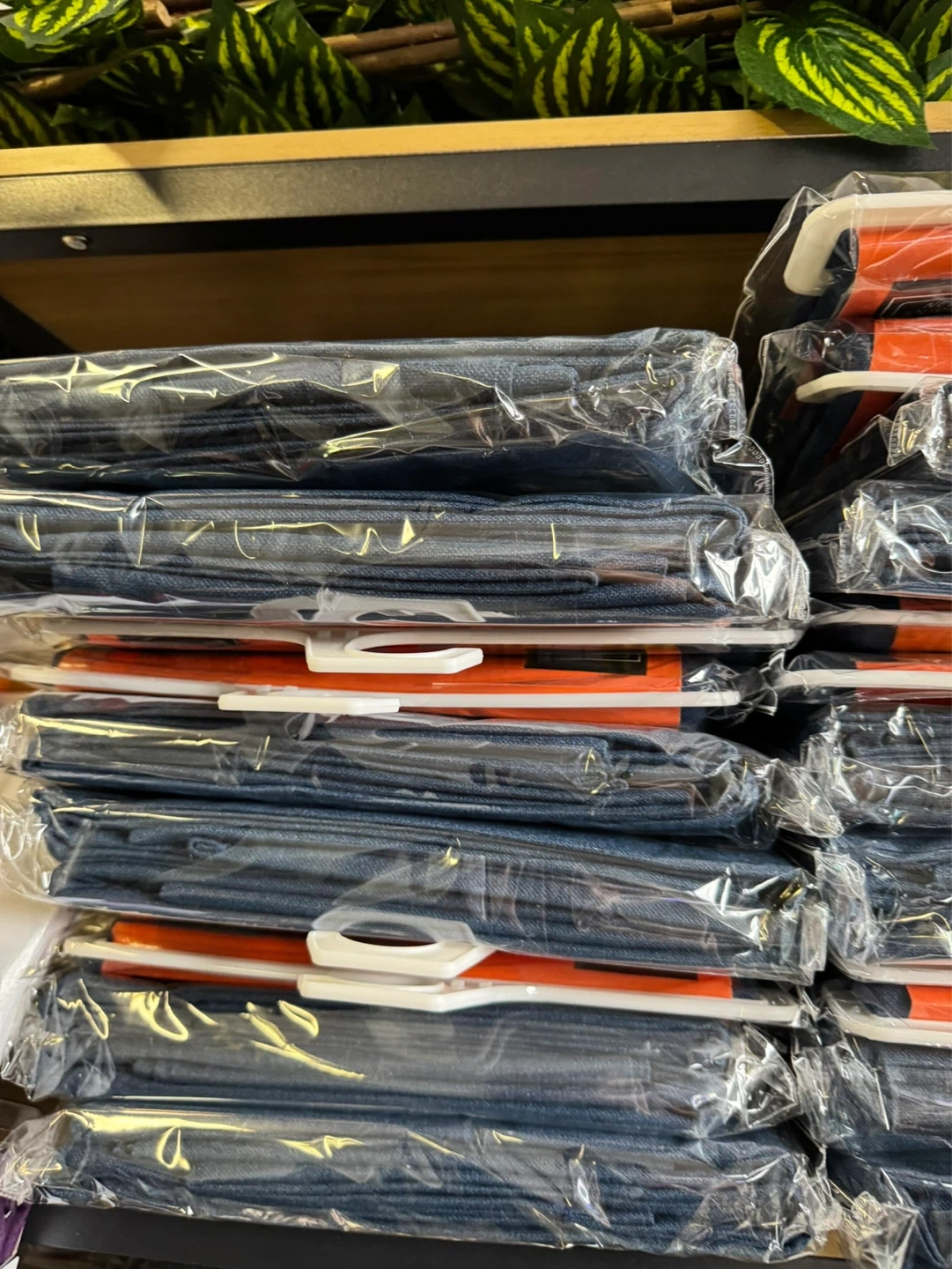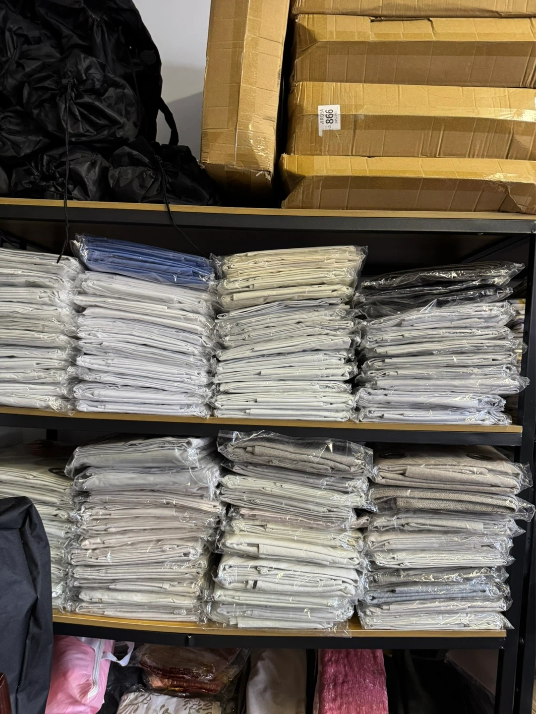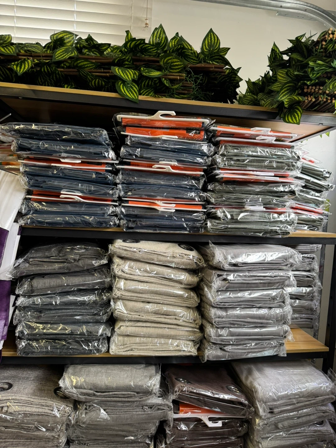Multiple stacks of blackout curtains in various neutral and dark colours. They appear to be made of polyester fabric. Each package includes 1 panel.
