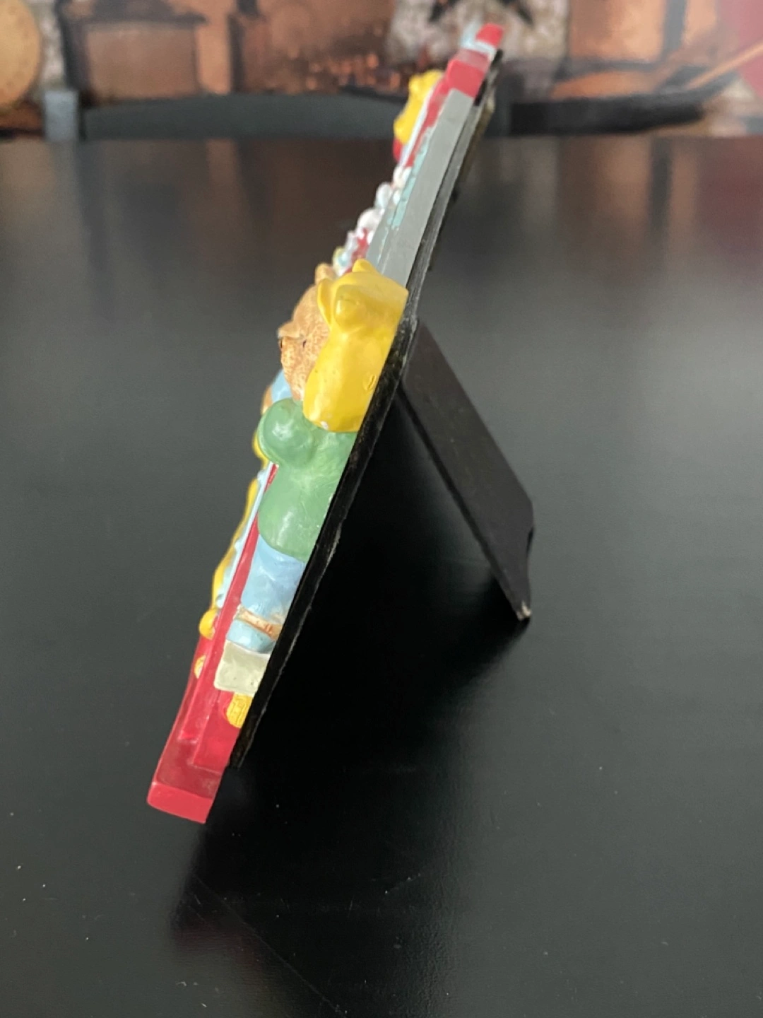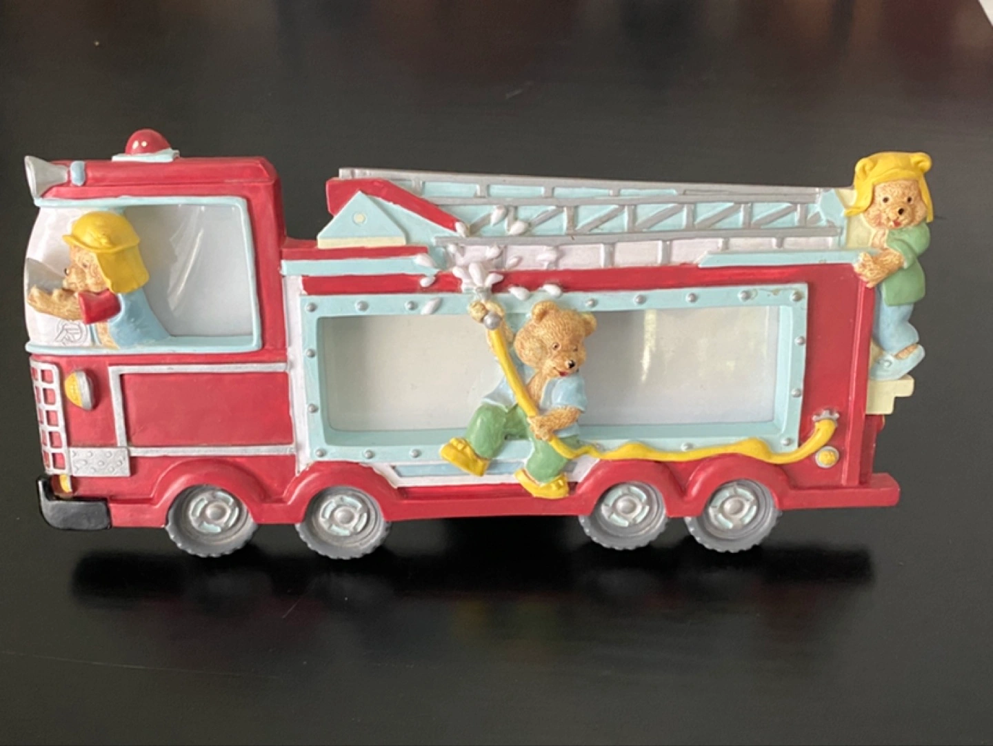 Cute ceramic firetruck-shaped table picture frame. Features three teddy bears doing their job. Holds 3 photos. Perfect for the collector.