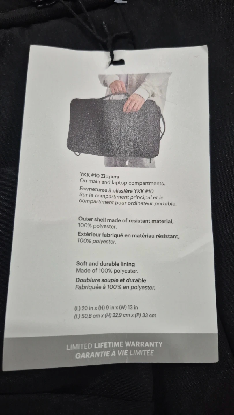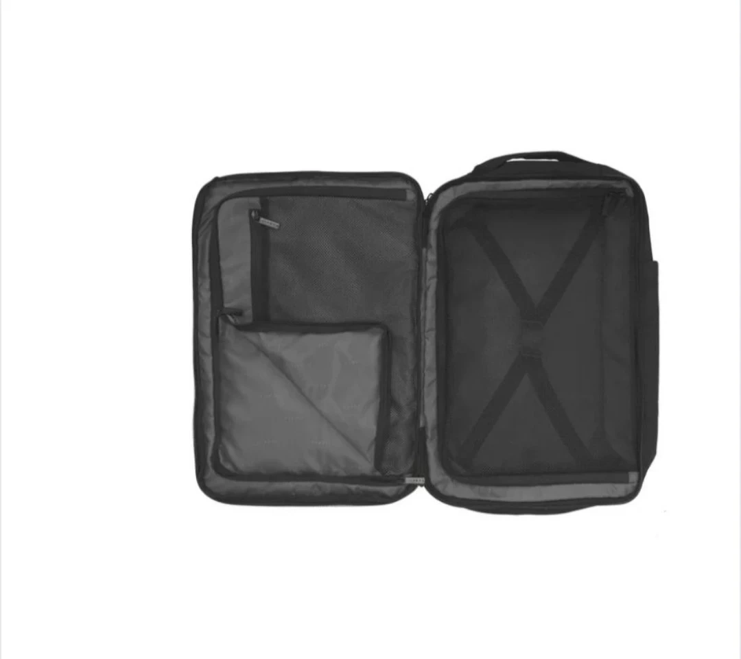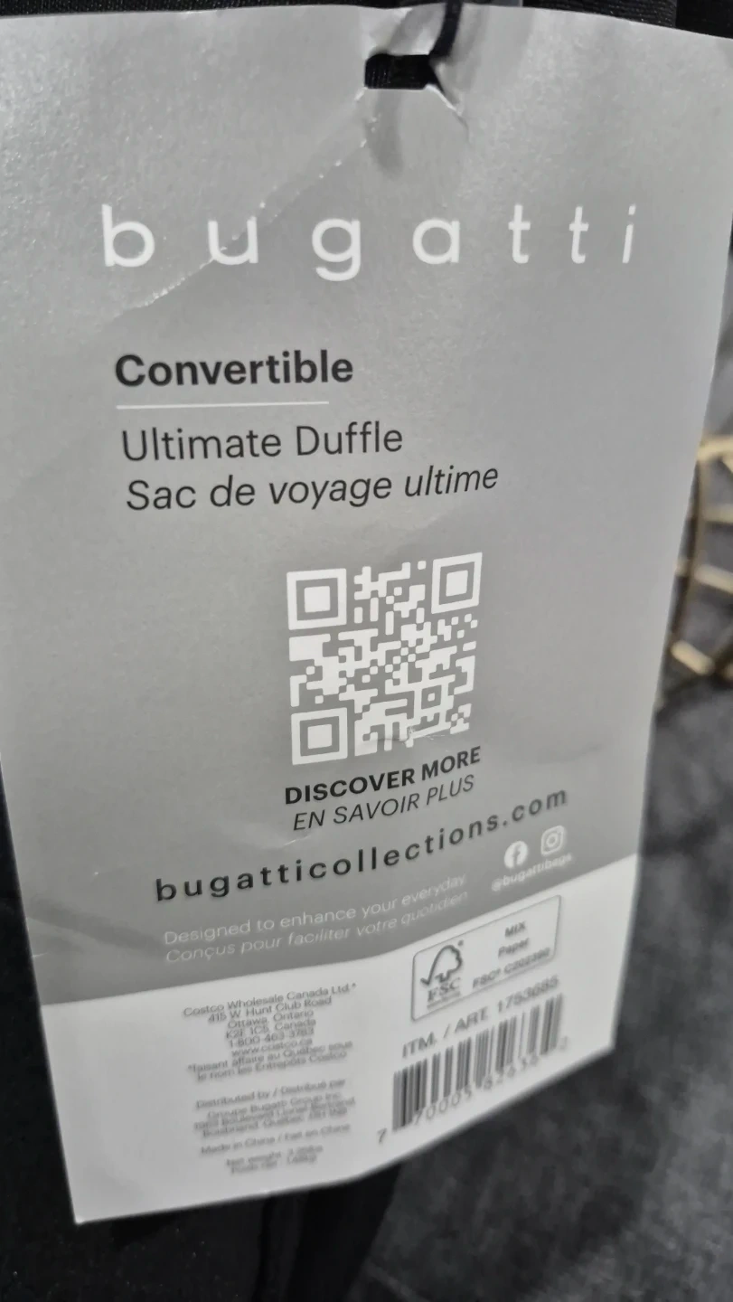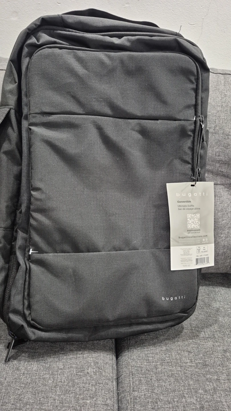 Bugatti convertible duffle bag in black. Features YKK #10 zippers and laptop compartments. Made of resistant polyester material with a soft and durable lining. Dimensions are 20 in x 9 in x 13 in.