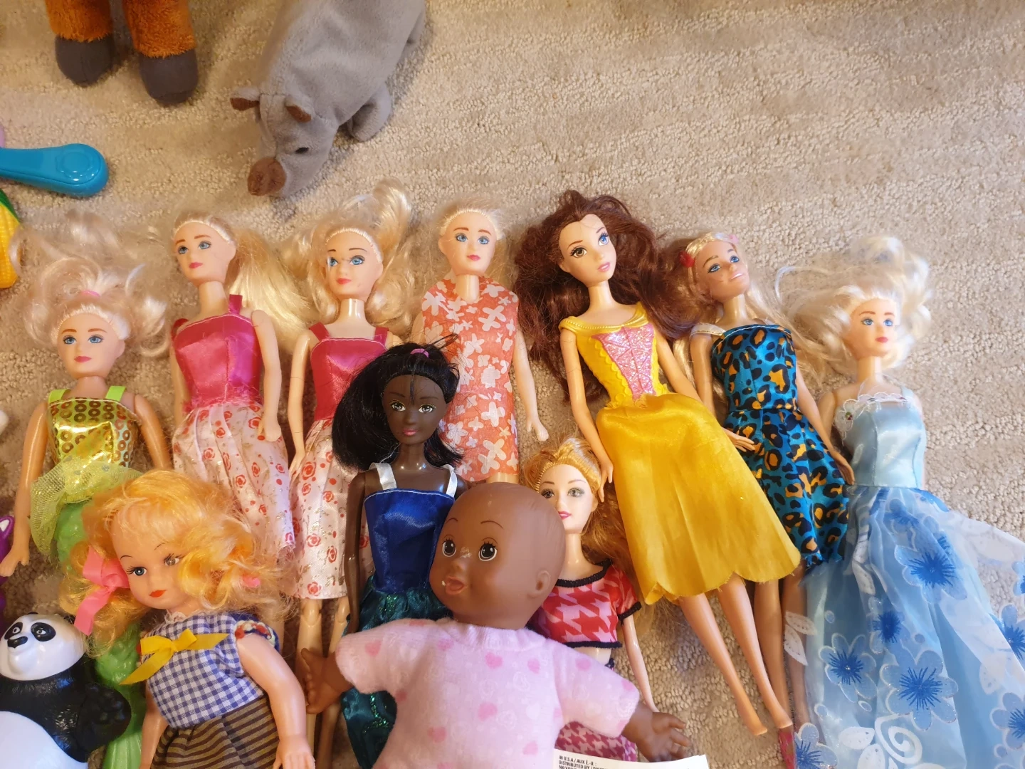 A collection of various dolls, including Barbie-style figures and other character toys. It also contains assorted play accessories like a toy hairdryer and kitchen items. These toys are great for imaginative play and can provide hours of entertainment.