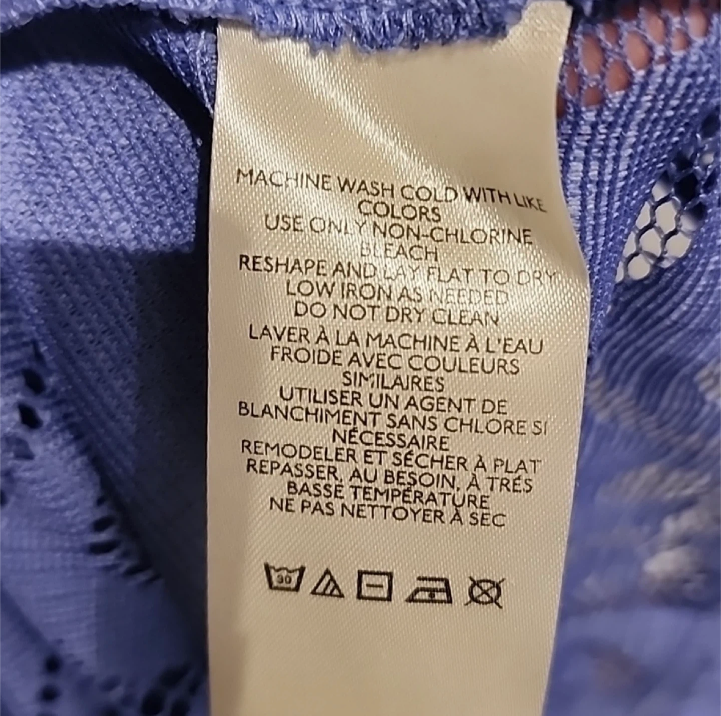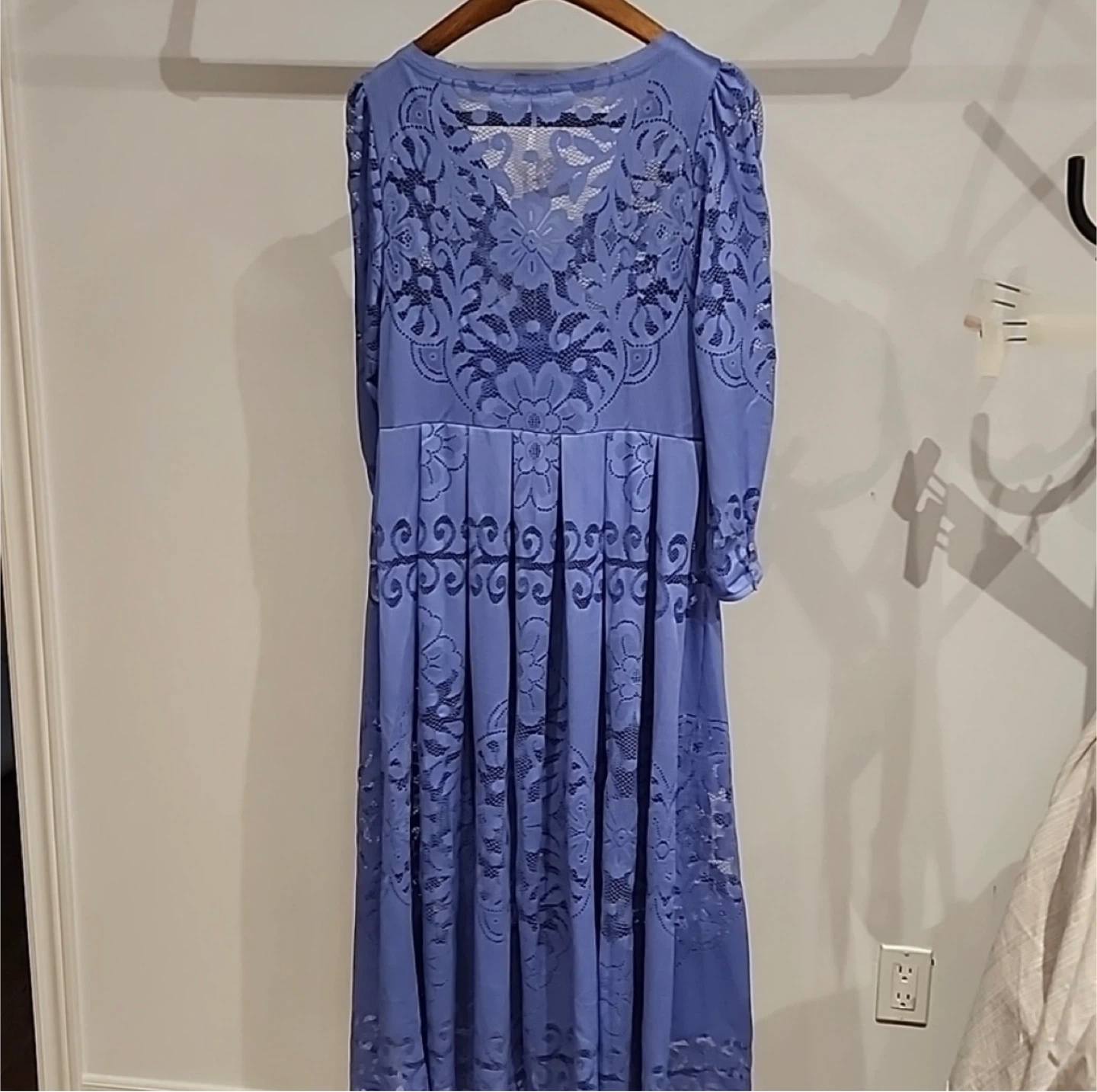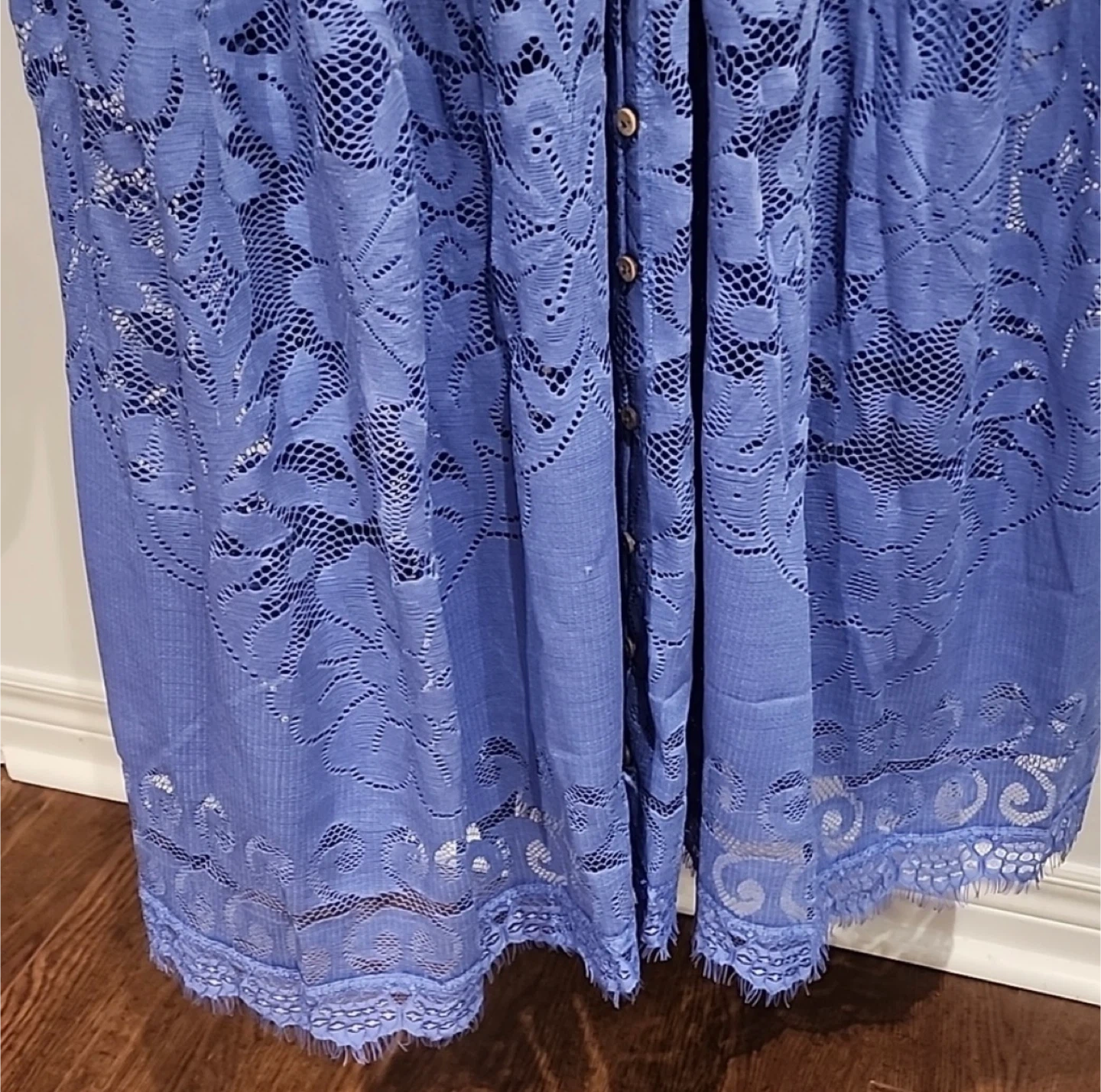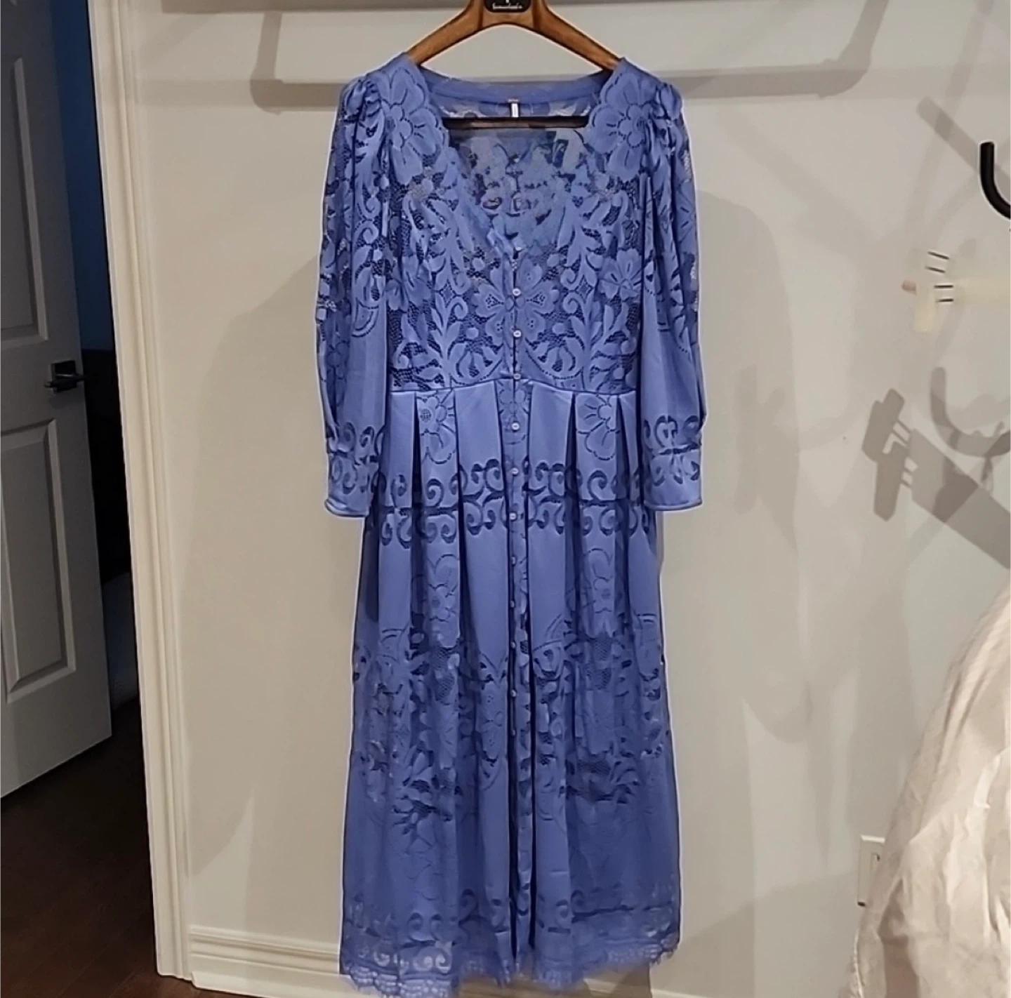This is a Free People maxi dress. It's a beautiful periwinkle blue colour with intricate lace detailing throughout. The dress features a V-neckline, long puff sleeves with button cuffs, and a flowy skirt. It's perfect for a special occasion or a stylish daytime look!