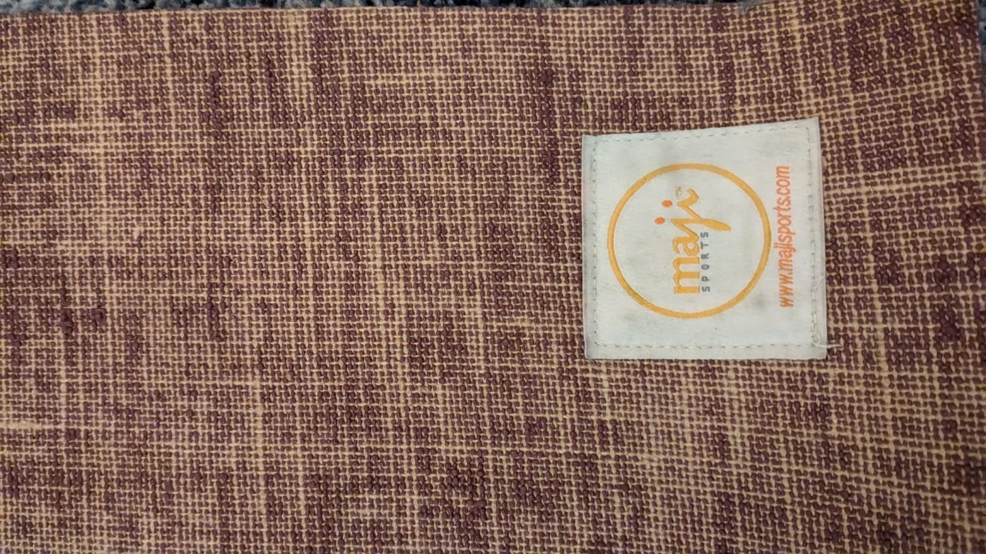 This is a Maji Sports yoga mat in a dusky rose colour. It comes with a patterned carrying strap. The mat's surface has a subtle woven texture.