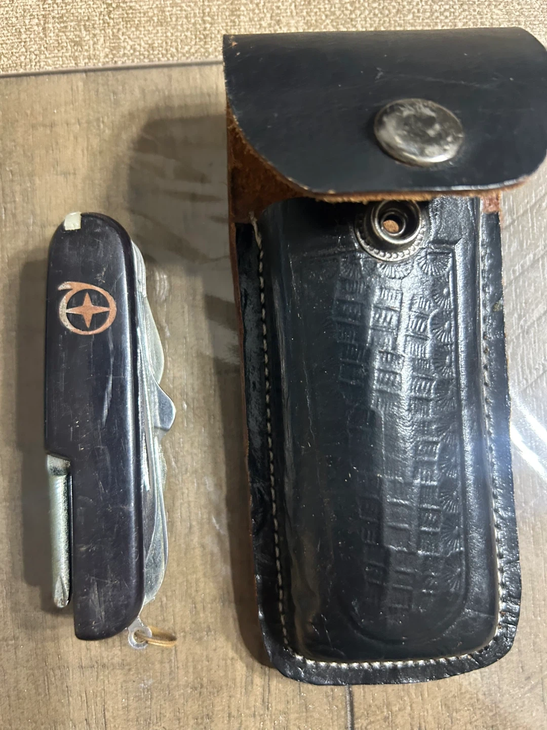 This is a vintage multi-tool pocket knife in black. It includes a black embossed leather pouch for storage. The knife appears to have a screwdriver and other folding tools. The pouch closes with a metal snap button.