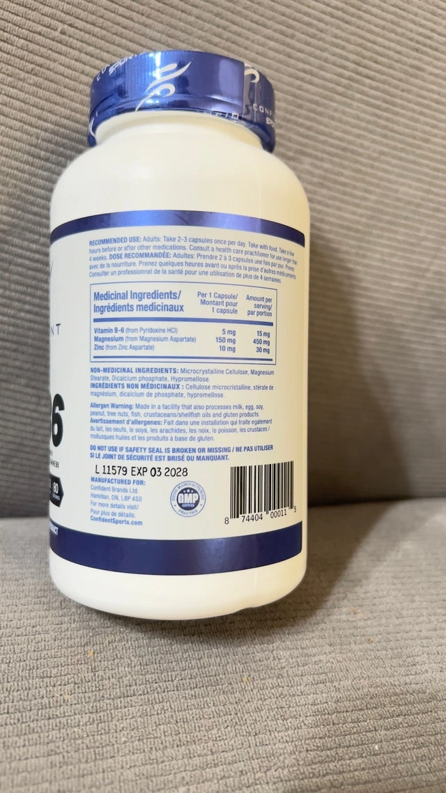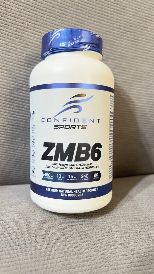 Selling a bottle of Confident Sports ZMB6, containing zinc, magnesium, and vitamin B6. The bottle has 240 capsules and expires in March 2028. Details: 450mg Magnesium, 10mg Zinc, 15mg Vitamin B6. If the ad is still up, the item is still available.
