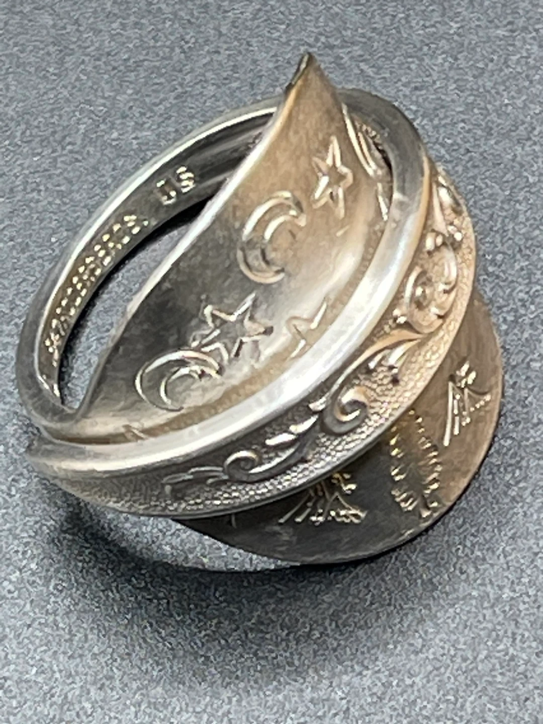 Handmade spoon ring featuring celestial moon and star designs, with a tree motif on the band. It's made from silverware, giving it a unique vintage charm. This adjustable ring is a neat conversation piece!