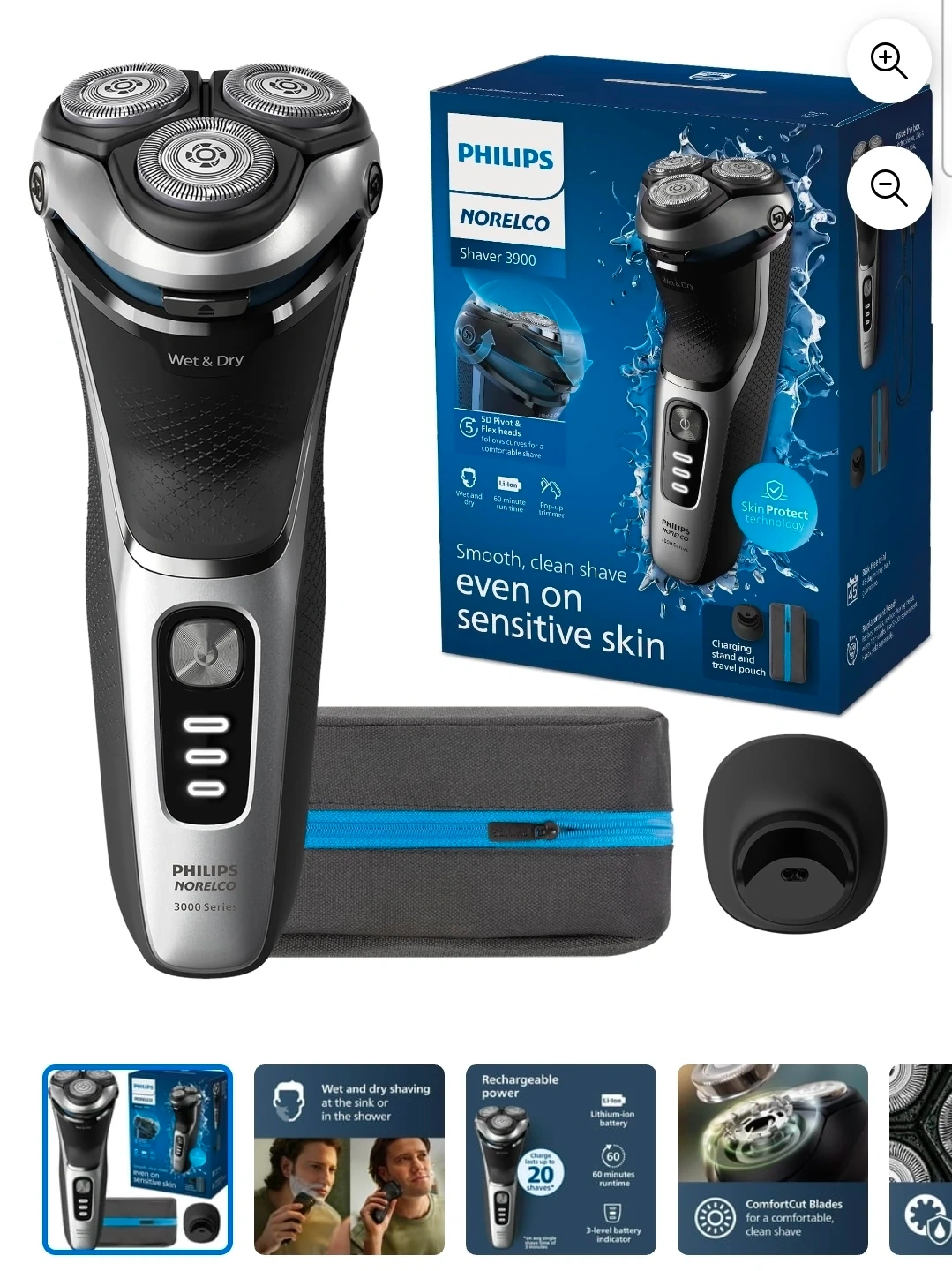 This is a Philips Norelco Shaver 3900, a rechargeable wet & dry electric shaver. It features a 60-minute runtime on a full charge. Includes charging stand and travel pouch.