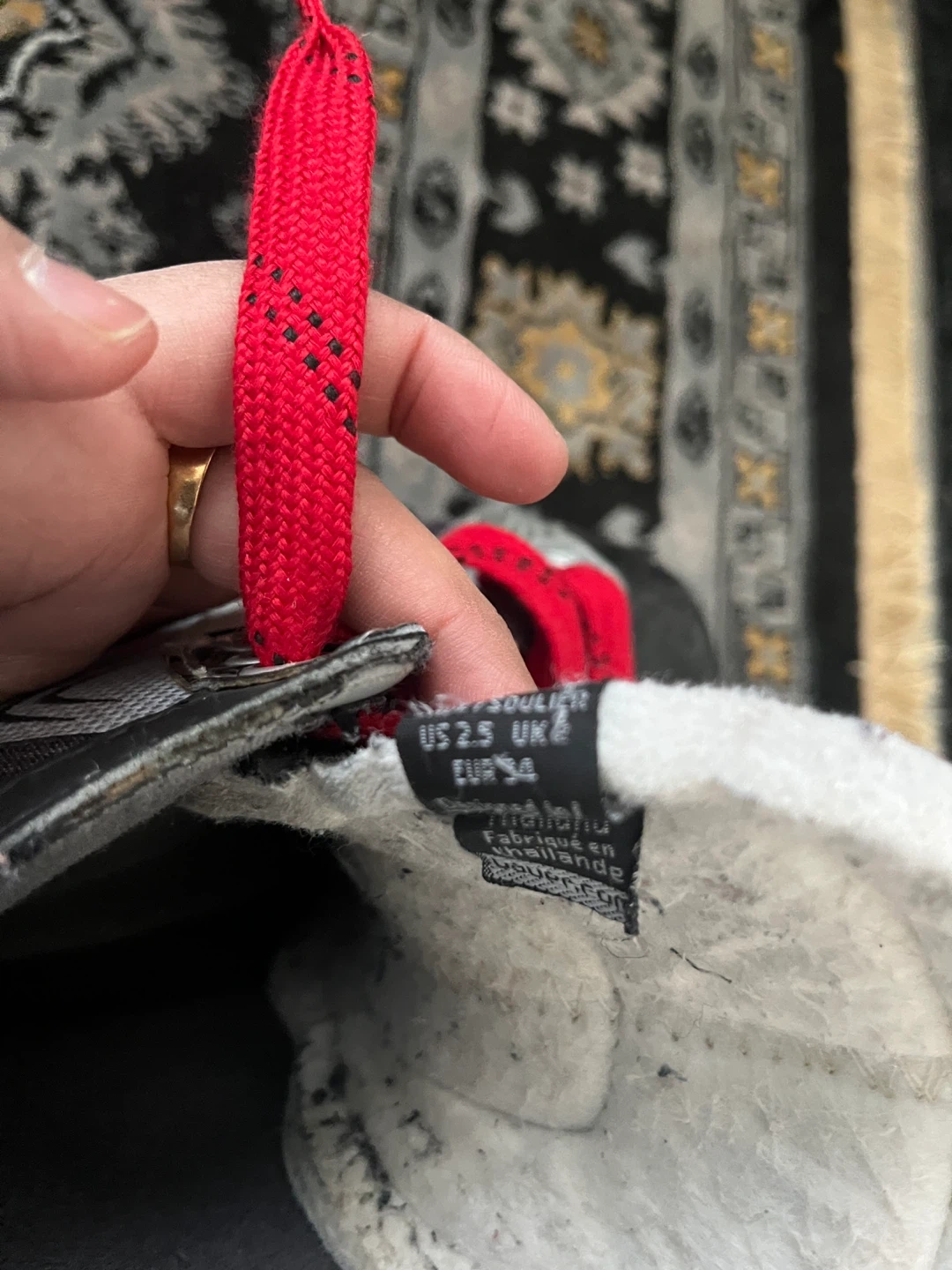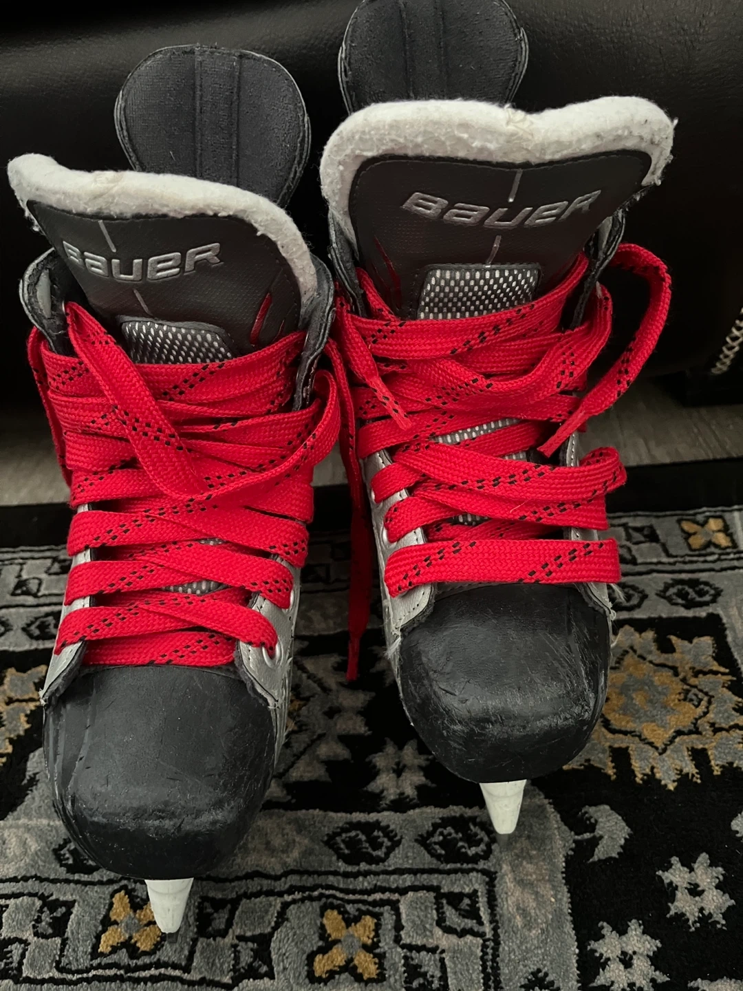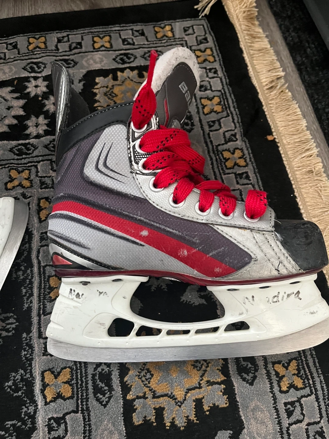 These are Bauer youth hockey skates. Size is US 2.5, UK 1.5, EUR 34. They feature red laces and a black, red, and grey design. Perfect for kids just starting out on the ice!