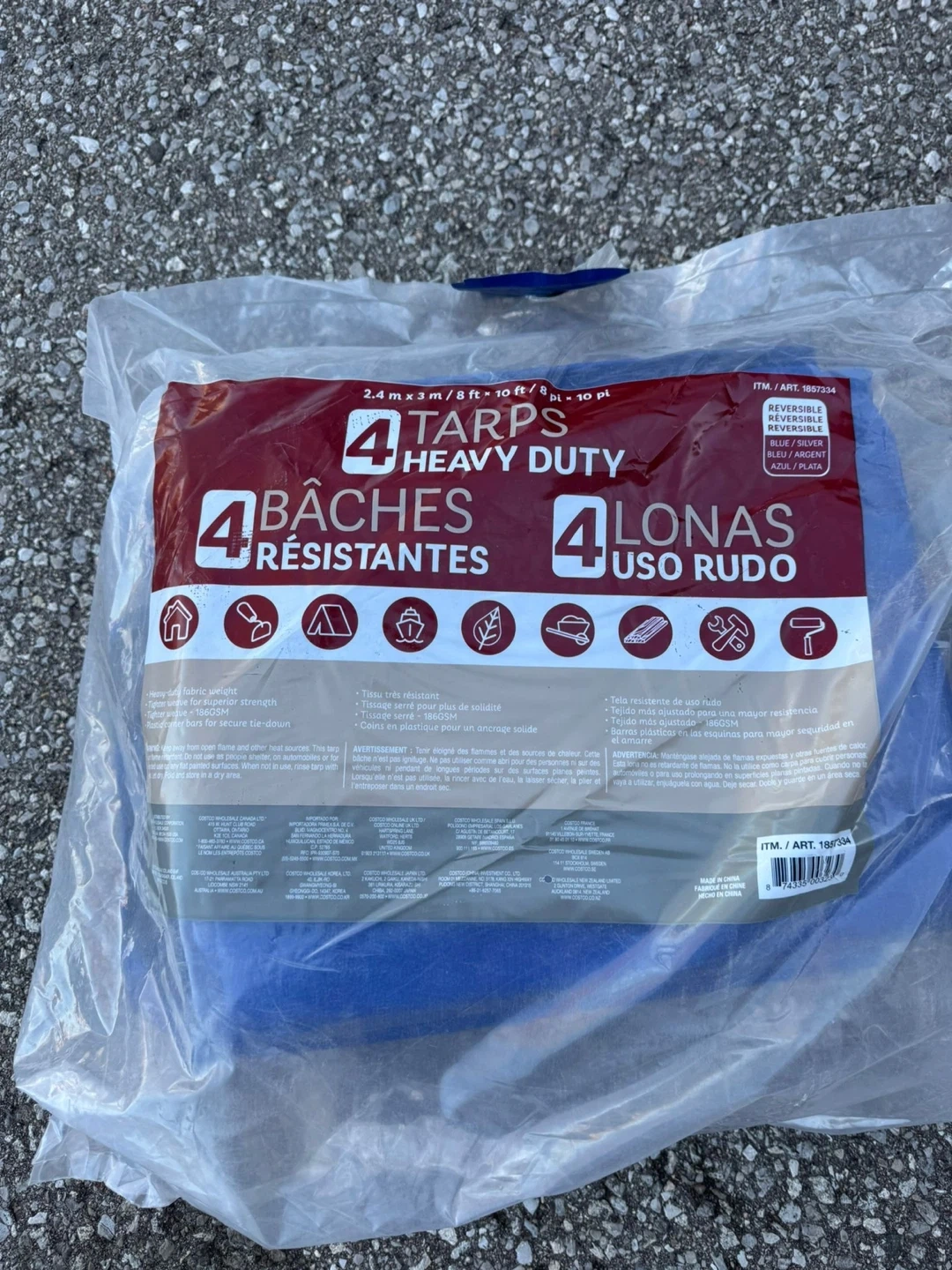 Brand new 4-pack of heavy duty tarps, still sealed in original packaging.