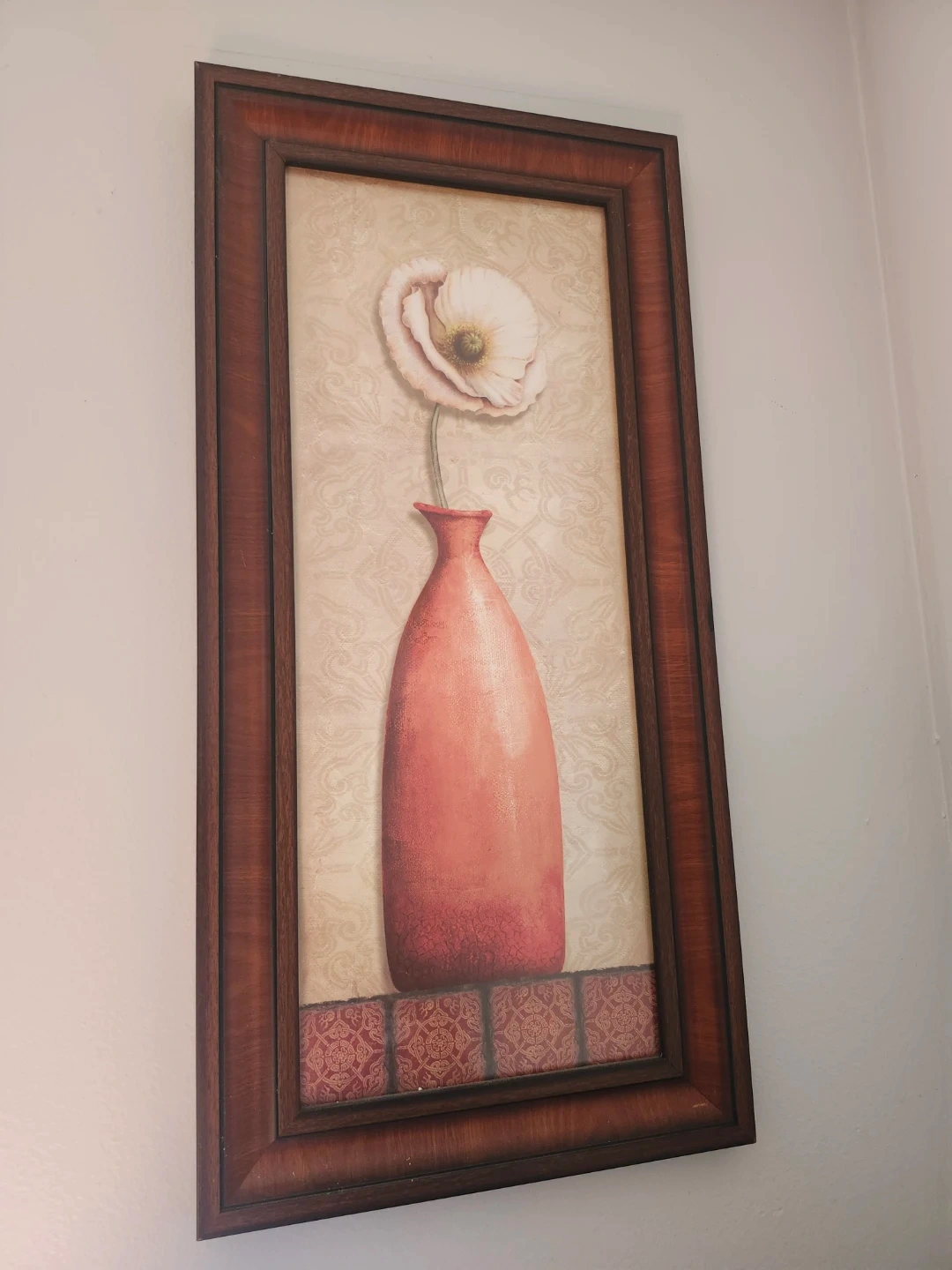 This is a framed piece of wall art featuring a delicate pink flower in a coral-coloured vase. The background has a subtle damask pattern. The frame is a dark wood finish. It's a lovely decorative accent for any room!